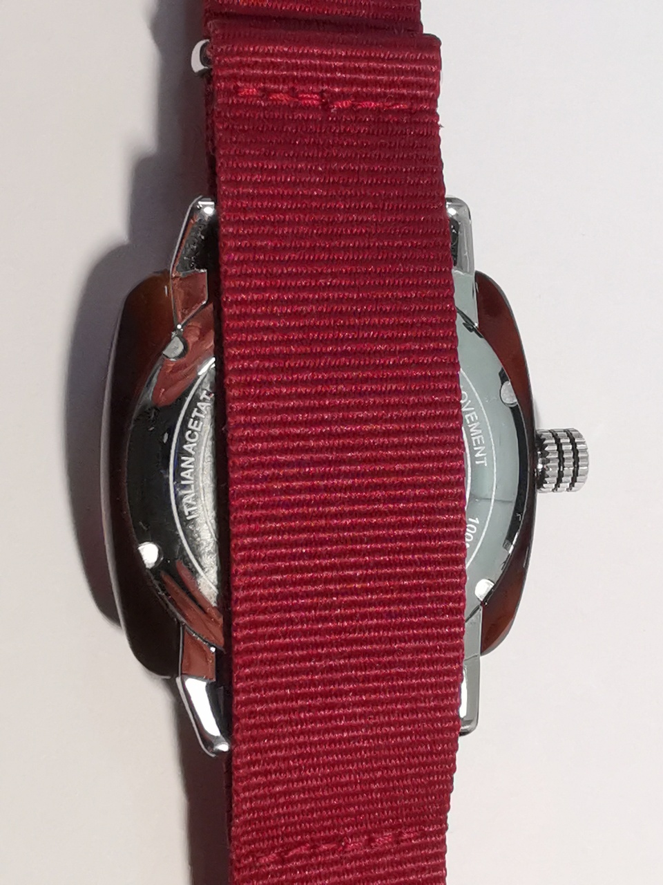 Часы упакованы в белую картонную коробочку, очень скромно. Сами часики на подушечке, упакованы в пленки, всё как полагается. Инструкции и сопровождающие документы тоже есть. Корпус часов небольшой 40х40 мм, на мой взгляд немного маловато для мужчины, но вполне подойдет женщине, хотя данная модель изначально позиционируется как мужская. Внешний корпус часов выполнен из итальянского ацетата Мацукелли, из которого изготавливают оправы очков. С точки зрения ежедневного ношения это скорее минус, так как ацетат довольно мягкий материал и подвержен образованию царапин. Ну и если уж начистоту, то часы больше смотрятся бижутерией, чем серьезными часами. Опять же напрашивается вопрос о женской целевой аудитории.