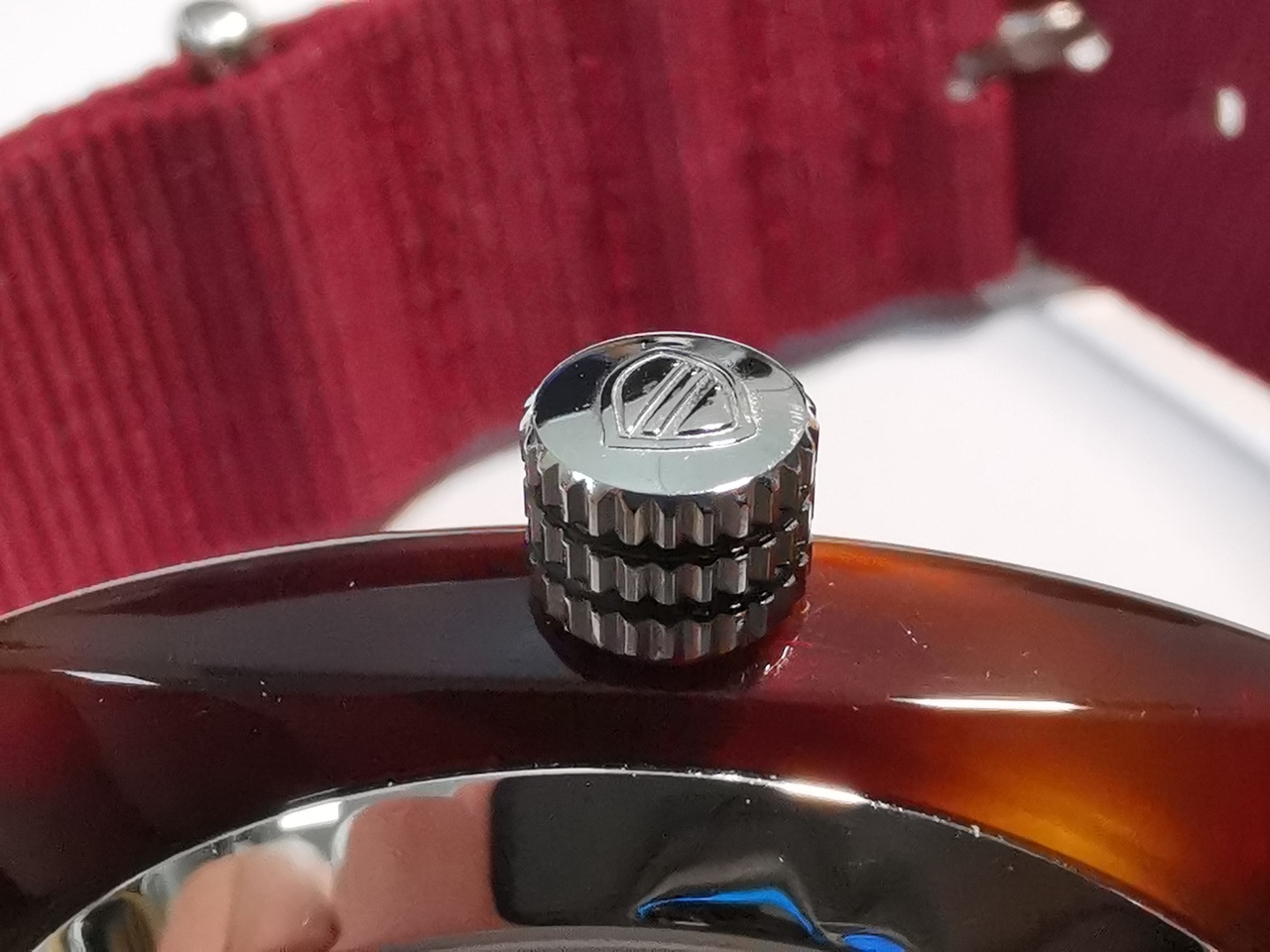 Заводная головка цилиндрическая, вытянутая, имеет продольные насечки-ребра(треугольные в сечении). Головка настолько высокая, что на ней хватило места на две перпендикулярные канавки, в которые установлены резинки для лучшего охвата головки пальцами. На верхней части головки имеется выпуклый рельеф в виде итальянского щита с диагональной полосой. В часах установлен кварцевый механизм Мийота 2315.