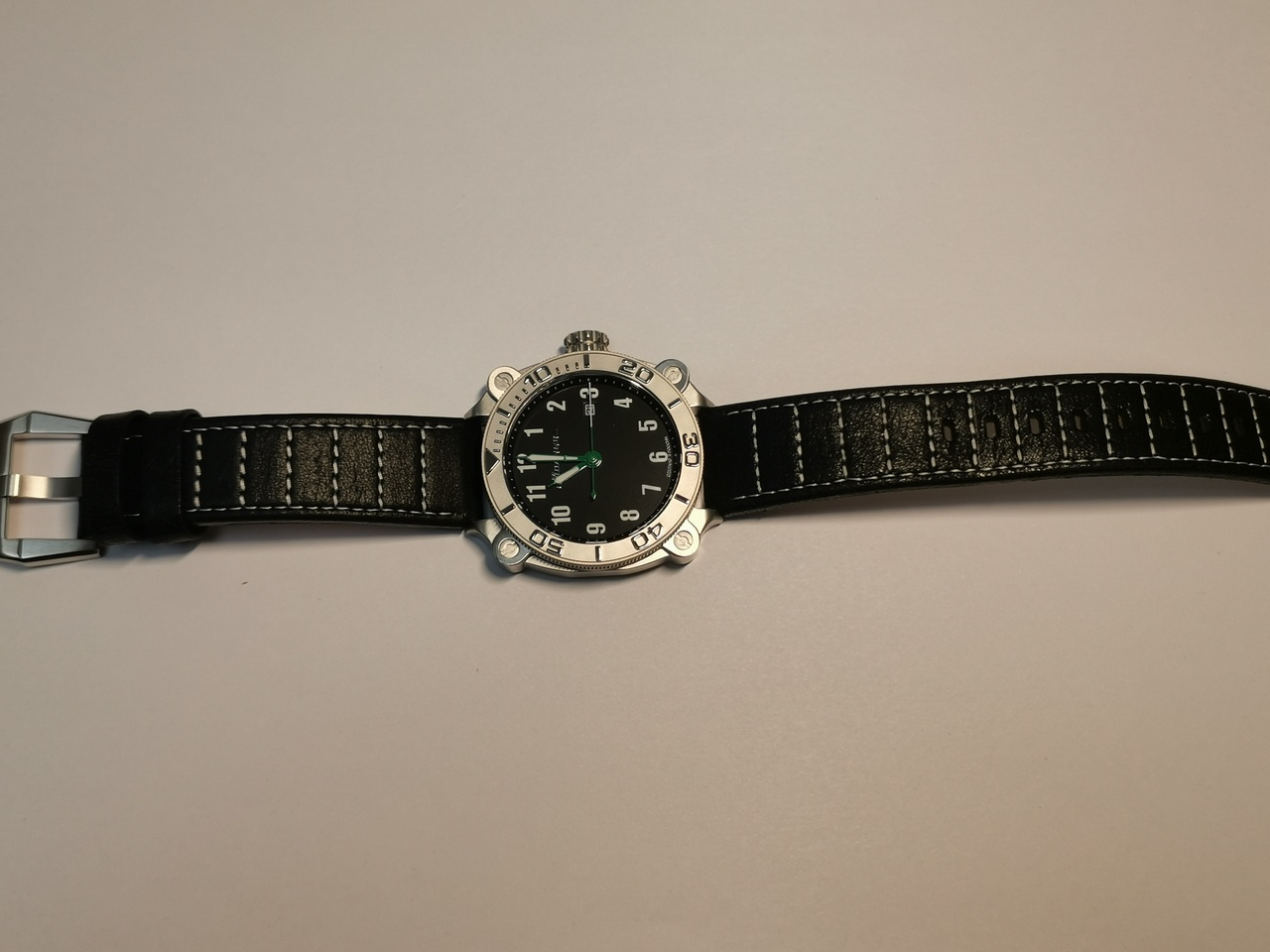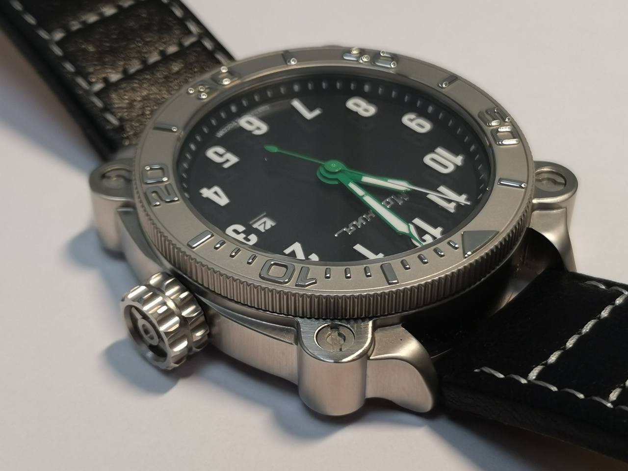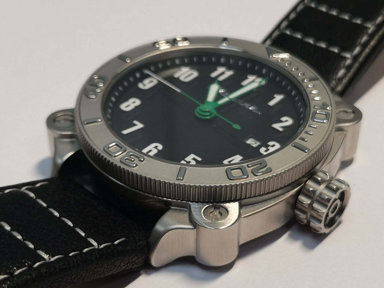 И, наконец, завершает облик часов установленный кожаный ремешок. Он трехслойный с красивым верхним слоем из несколько жестковатой, покрытой частыми кракелюрами черной кожи. Ремешок имеет интересную прострочку белой нитью, отсылающую к сегментарному делению гусеничной ленты. Судя по тисненой надписи с внутренней стороны ремешка: Genuine Leather, можно предположить, что он изготовлен не в России.