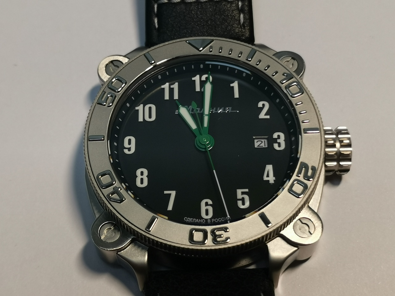 Итак, что мне понравилось в этих часах: Очень интересный дизайн корпуса с декоративными элементами напоминающими выступы для крепления прибора к стационарному основанию. Объёмный безель в стиле «Яхтмастера» довольно гармонично вписывается в общую картину. Все надписи на корпусе часов, циферблате, бакле ремешка, выполнены кириллицей на русском языке, что несколько подогревает патриотические чувства. Часовая разметка привлекает внимание красивыми накладными, и даже несколько парящими над полем циферблата белыми арабскими цифрами. Шрифт часовых меток без засечек, сильно напоминающий гротескный Haettenschweiler, эпохи промышленного дизайна 1960х-70х годов.