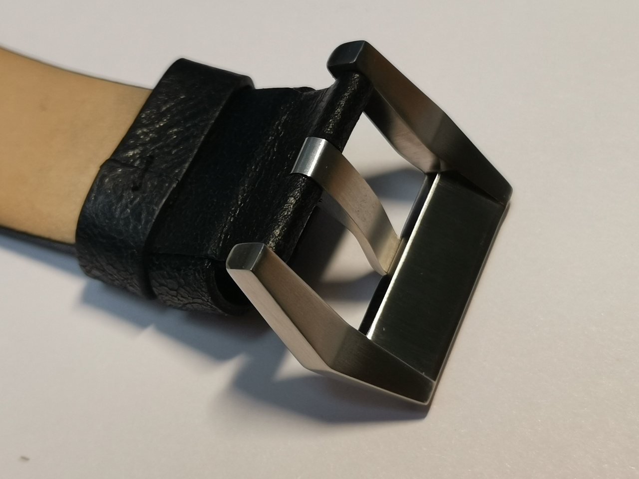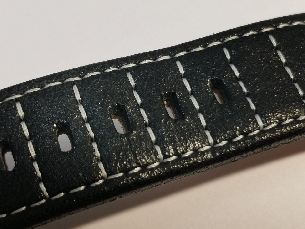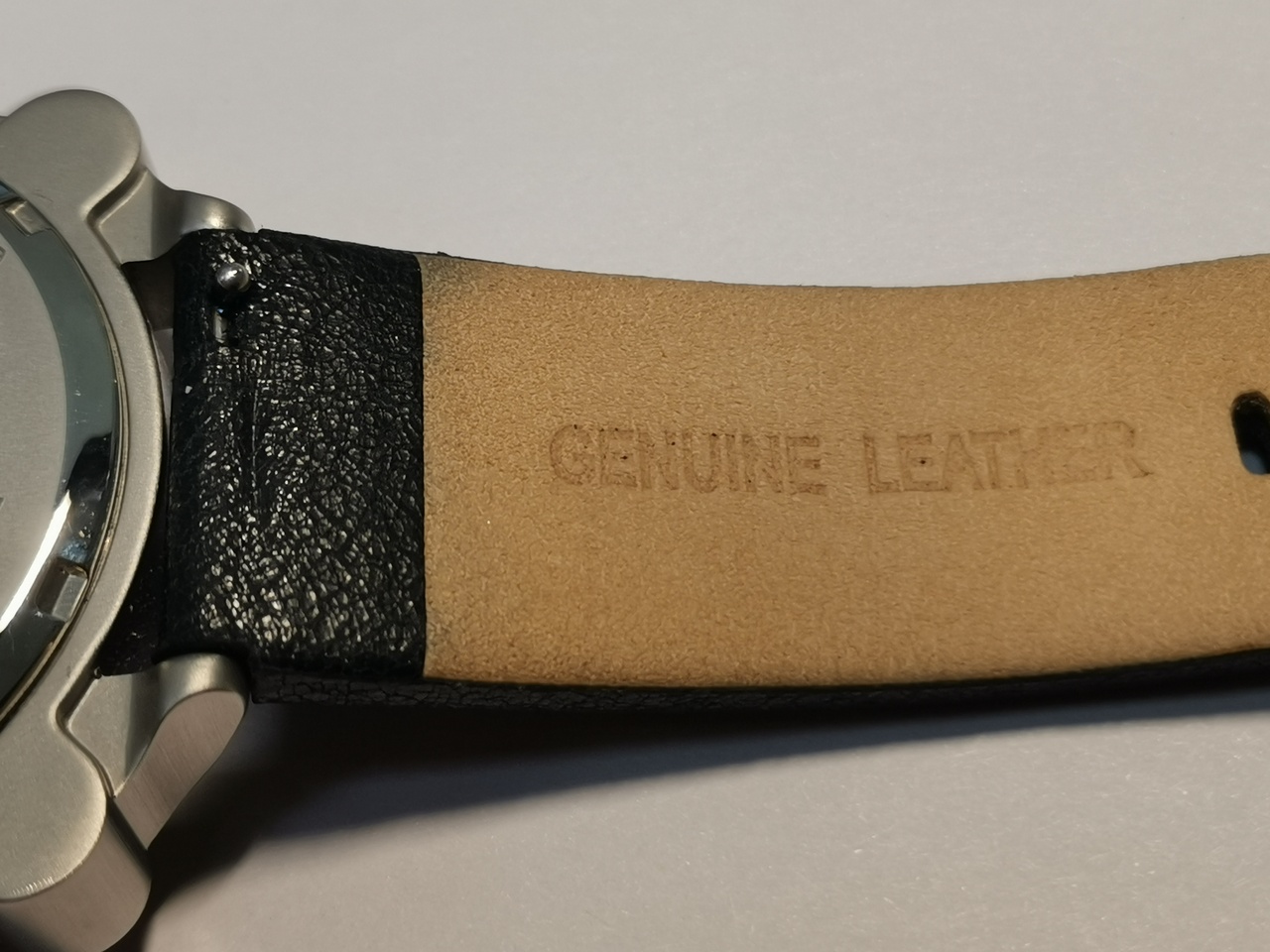 Ремешок установленный на часах имеет быстросъемные шпильки. Изготовлен в основном из кожи, имеет соответствующий запах. Наружная часть ремешка из текстурированной кожи с прострочкой. Прострочка не сквозная. Внутренняя часть напоминает плотную замшу, которая охотно окрашивается в черный цвет при контакте с внешней стороной, при застегивании ремешка.