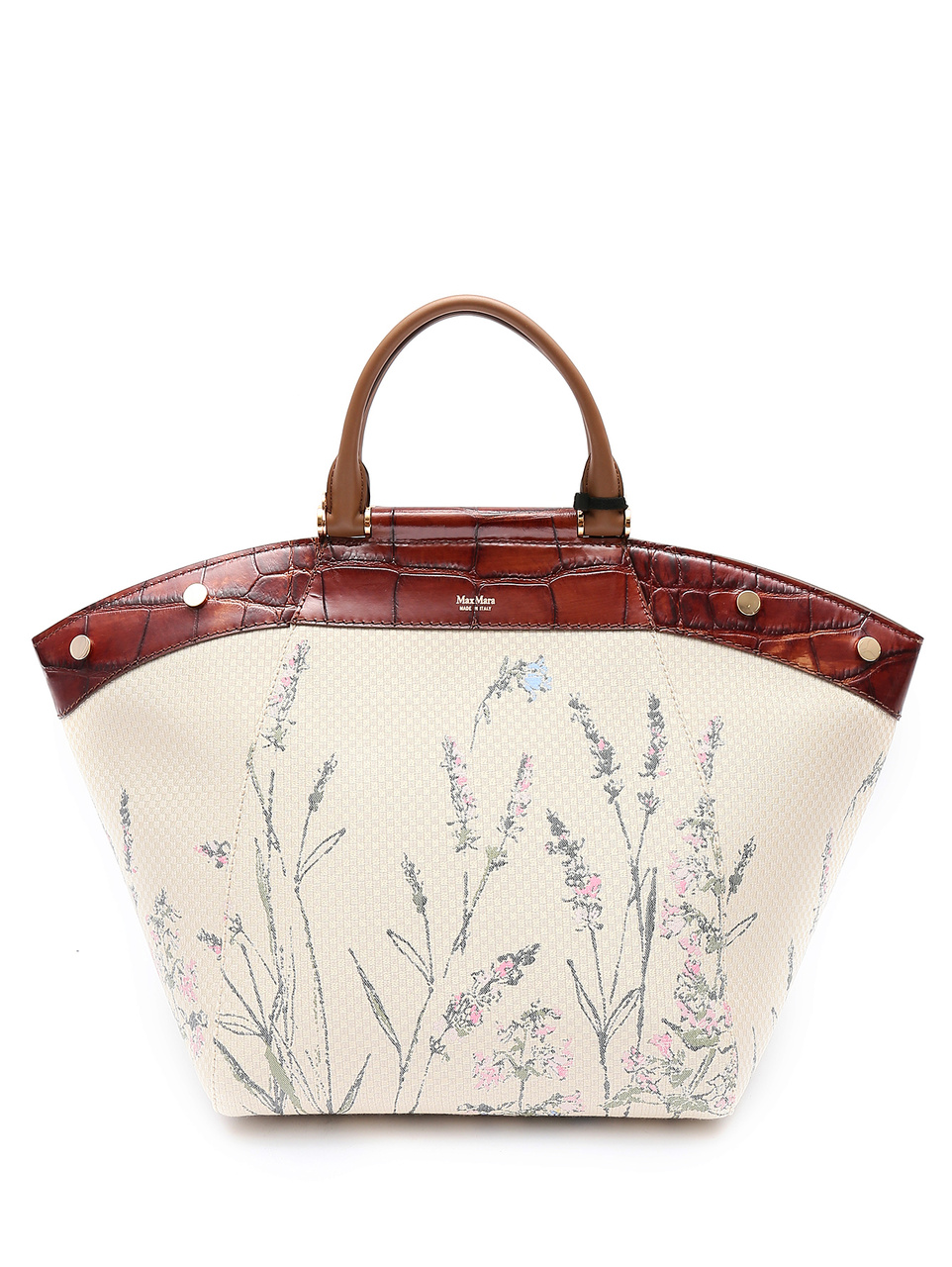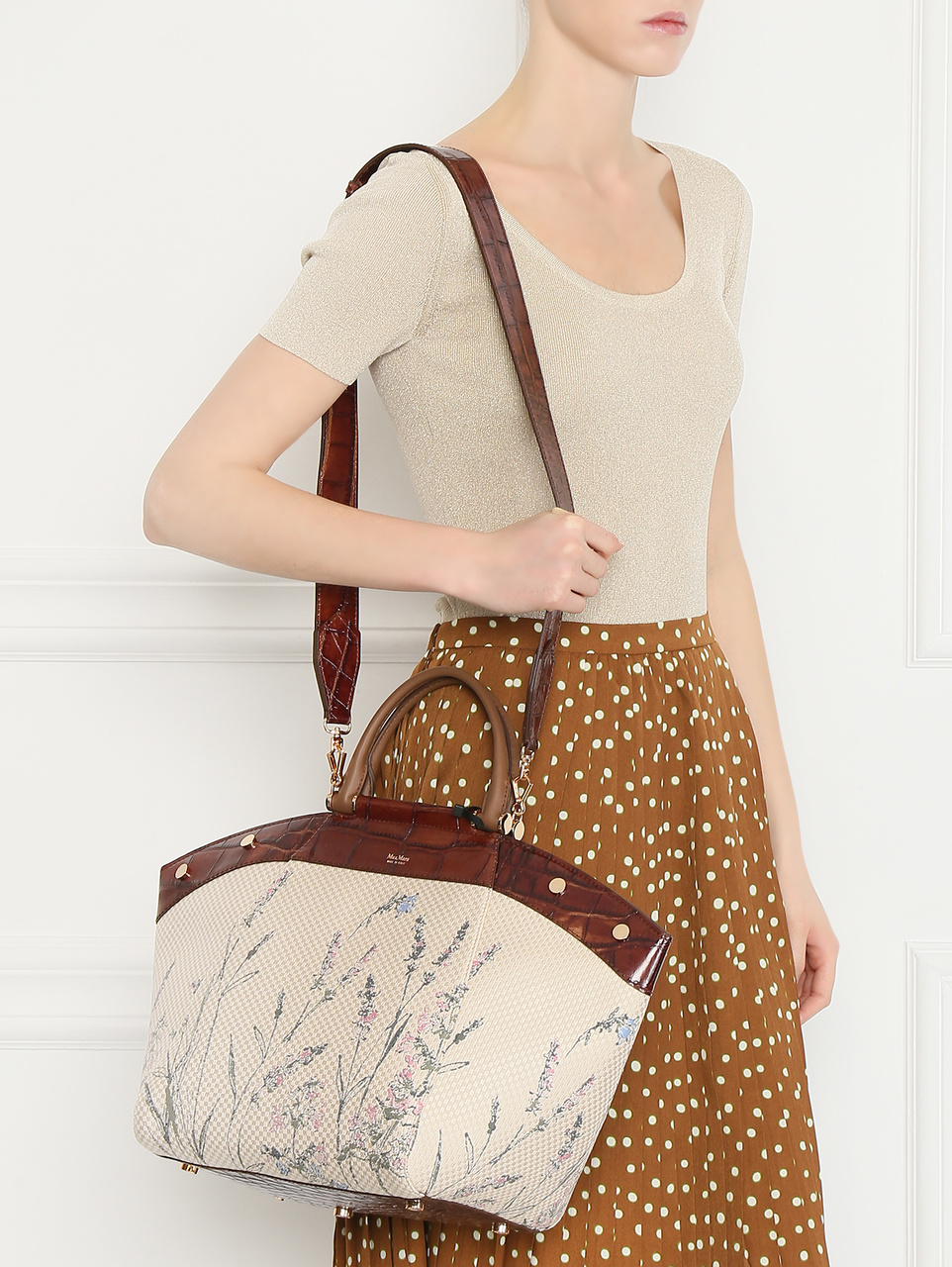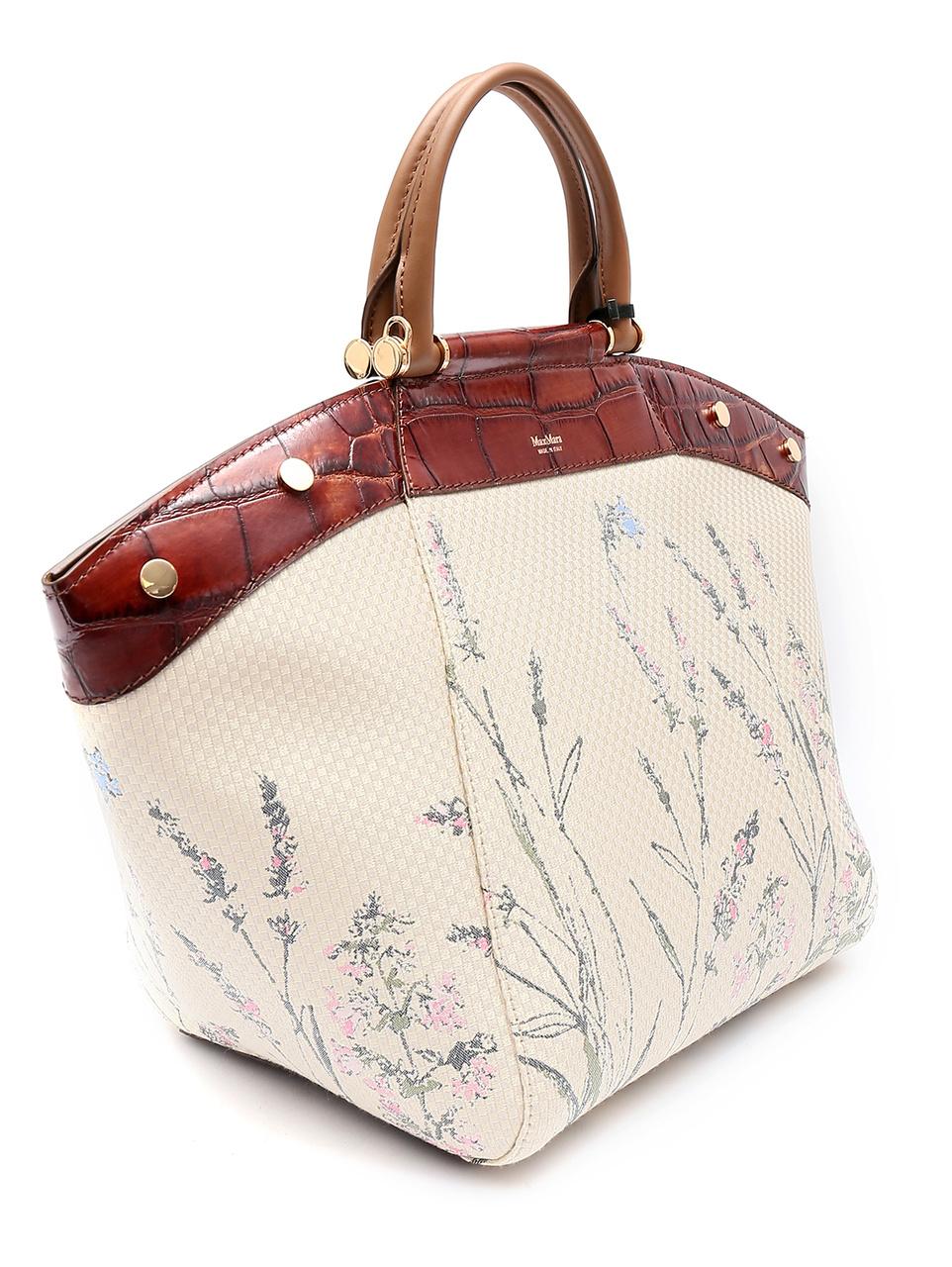 "Сумка Max Mara Anita в данной версии представлена в крупном размере, и выполнена из комбинации материалов - натуральной кожи теленка с принтом и изысканной жаккардовой ткани с вышитым цветочным узором. Легкая, но чрезвычайно вместительная, это ваша идеальная сумка формата "carry all" весенне-летного сезона!"