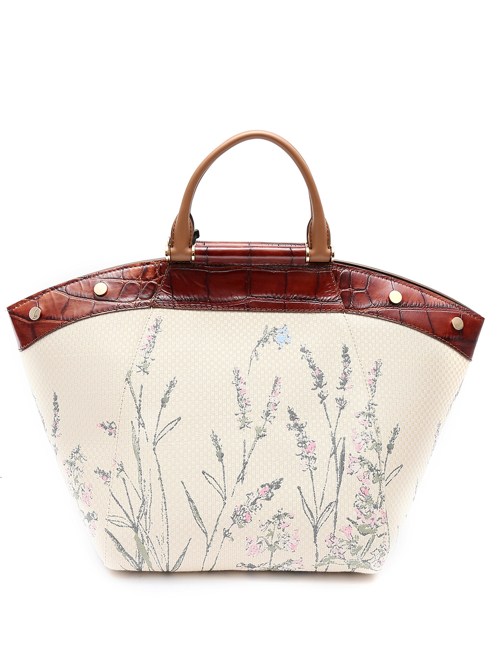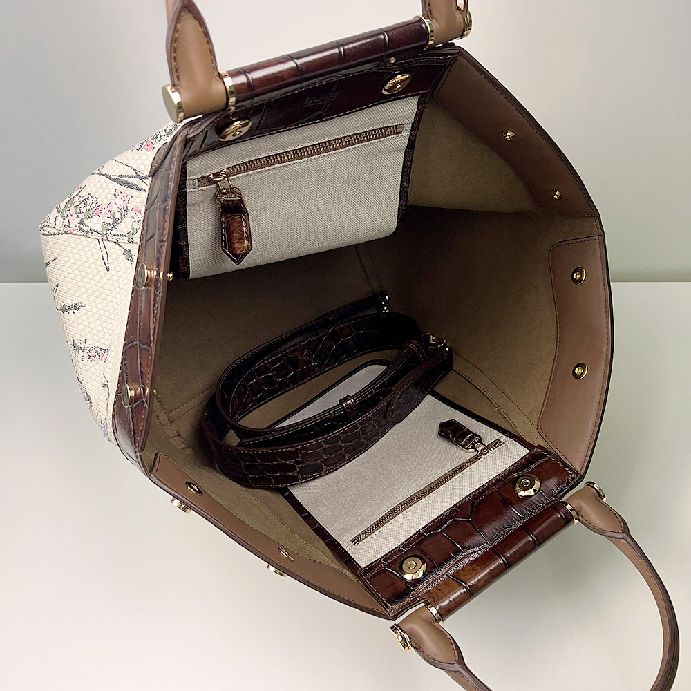 Материал - текстиль с вышитым флористическим узором и натуральная кожа с тиснением фактуры крокодила. Ручки и элементы отделки из матовой гладкой кожи.