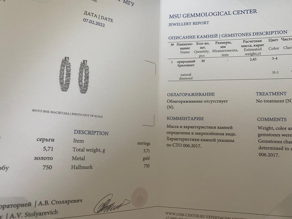 Серьги-кольца с бриллиантами 2,45 карата (аттестат МГУ)!