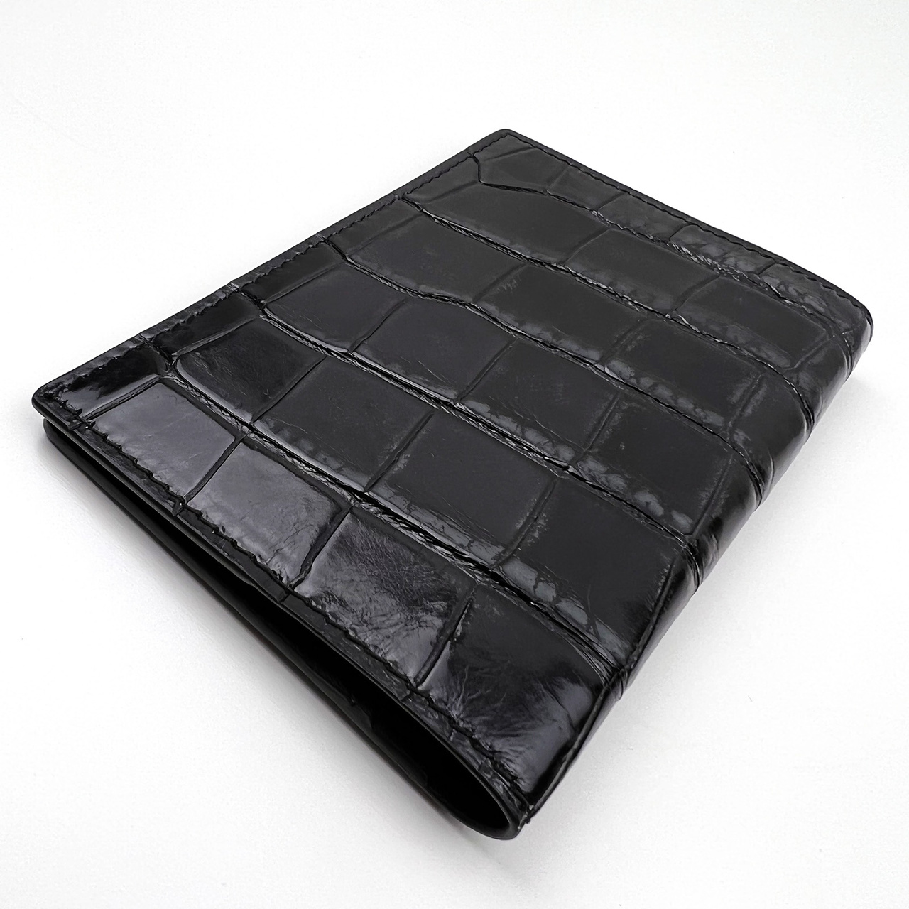 Особенность модели. Обложка выполнена из кожи крокодила, и окрашена в черный цвет. Затем мастера вручную с использованием специального инструмента немного "затирают" краску, создавая винтажный потертый эффект. Но это не все - далее получившееся полотно также вручную длительно полируется натуральным полировочным камнем, чтобы придать коже на всей площади (и там где она окрашена и там где краска как бы "потерта") одинаковую гладкость и равномерный естественный сатиновый блеск. То есть, никаких реальных потертостей, сдиров-шерховатостей на коже не будет: неоднородность окраса в готовом изделии является именно декоративным эффектом, на ощупь же кожа равномерная, с приятным мягким сатиновым блеском, и достигается этого именно ручной полировкой а не покрытием кожи лаком.