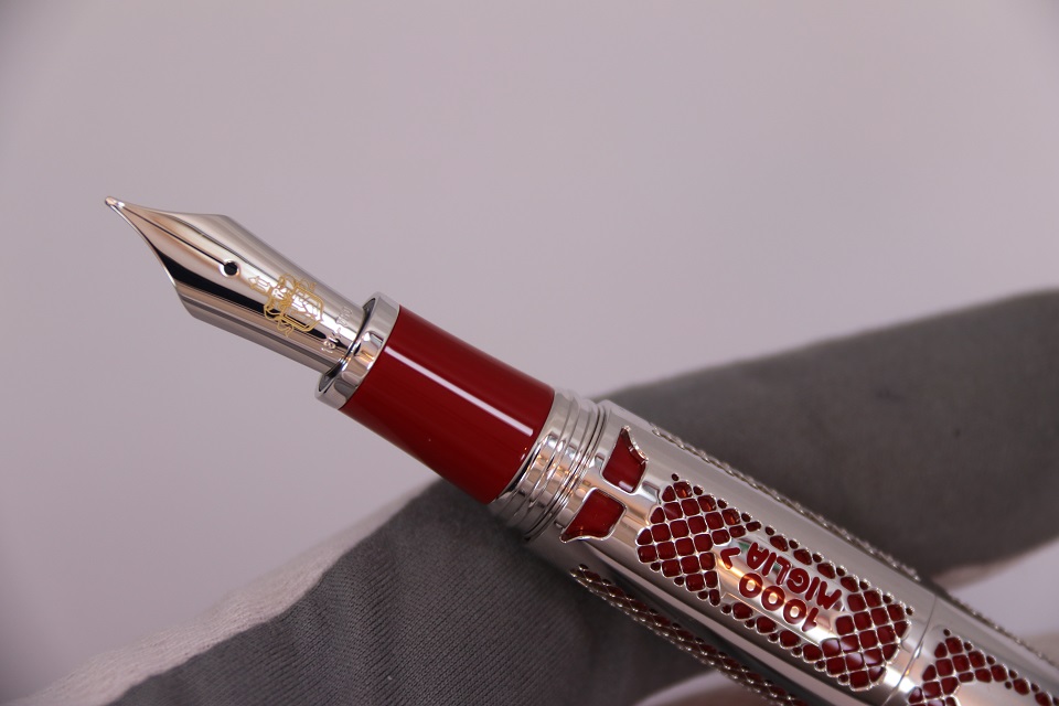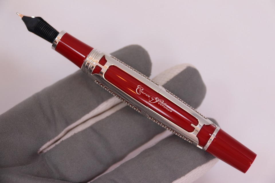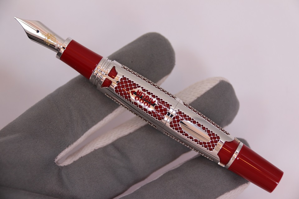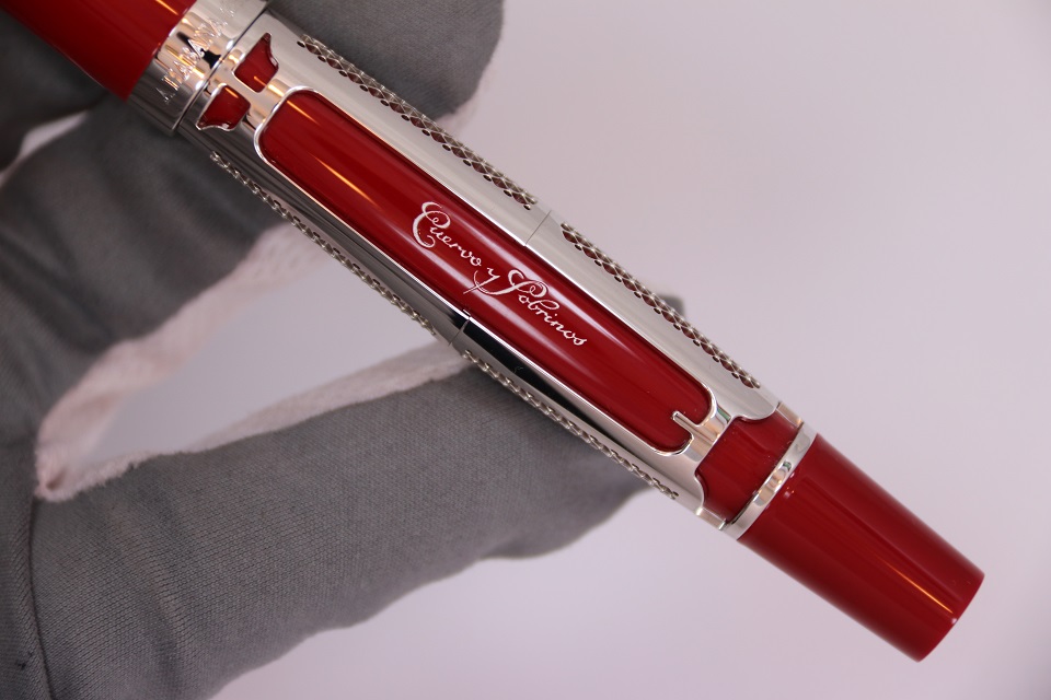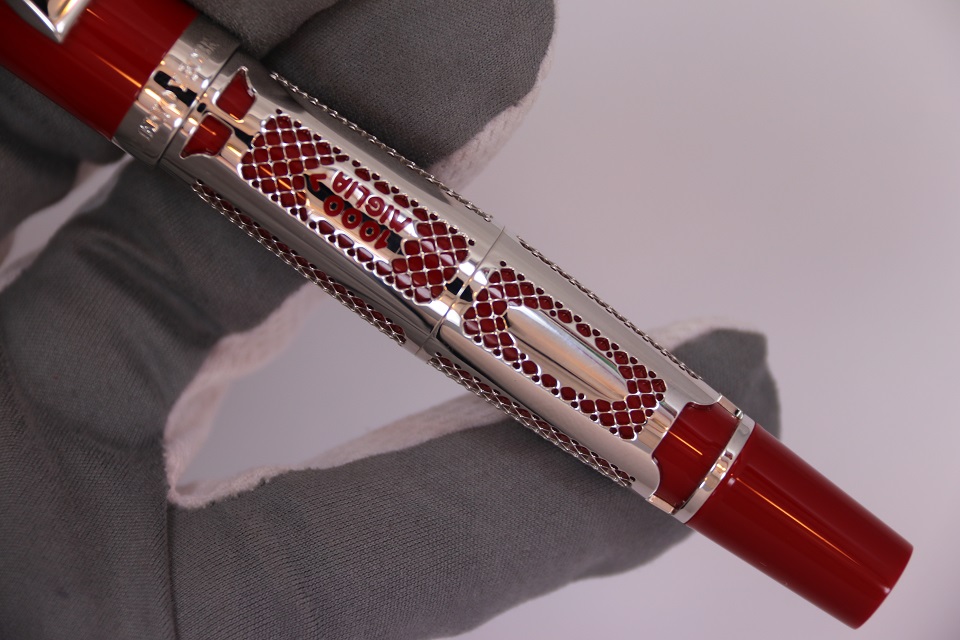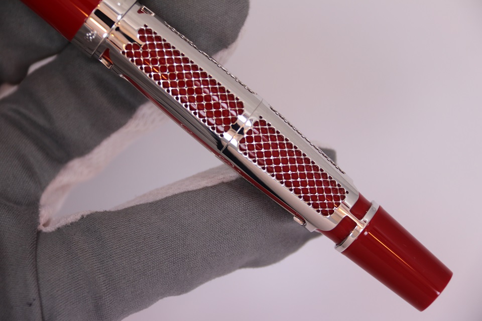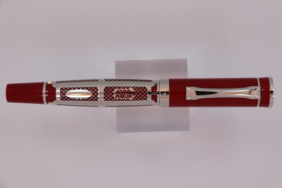 Корпус ручки выполнен из красной смолы цвета цвета '1000 Miglia red'. Элементы отделки напоминают старые радиаторные решетки классических автомобилей.