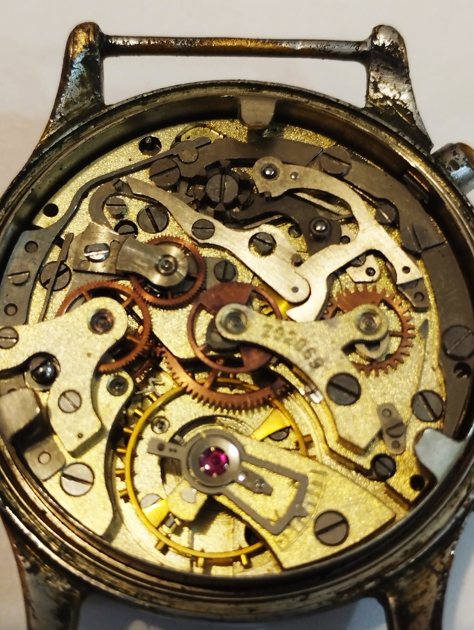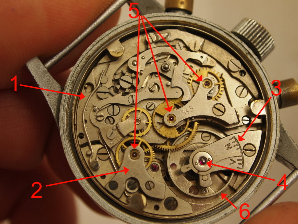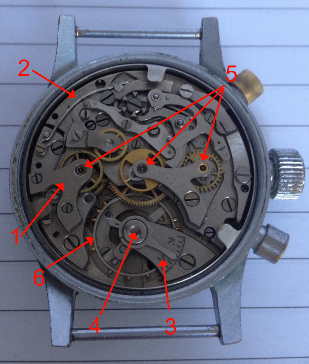 Механизмы с ранней нумерацией (6 знаков): (1) клейма на мосту нет, (2) даты выпуска нет, (3) градусник немецкий, (4) накладной камень белый, (5) камни хронографа в бушонах, (6) баланс белый.