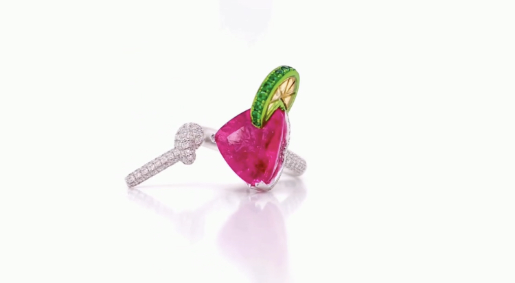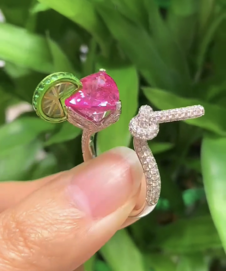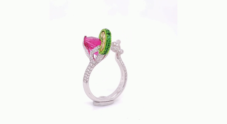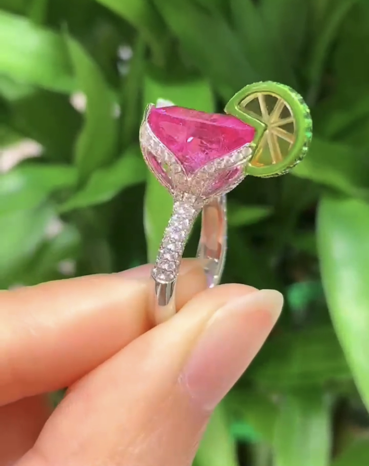 Вашему вниманию предлагаем приобрести эксклюзивное коктейльное кольцо выполненное из 18к белого золота, усыпанного брильянтами (1,066Ct) с центральным рубиновым турмалином (4,26Ct), а также зелёным цаворитом (0,17Ct) в виде кусочка лайма. Очень красивое и оригинальное кольцо! Видео по запросу.