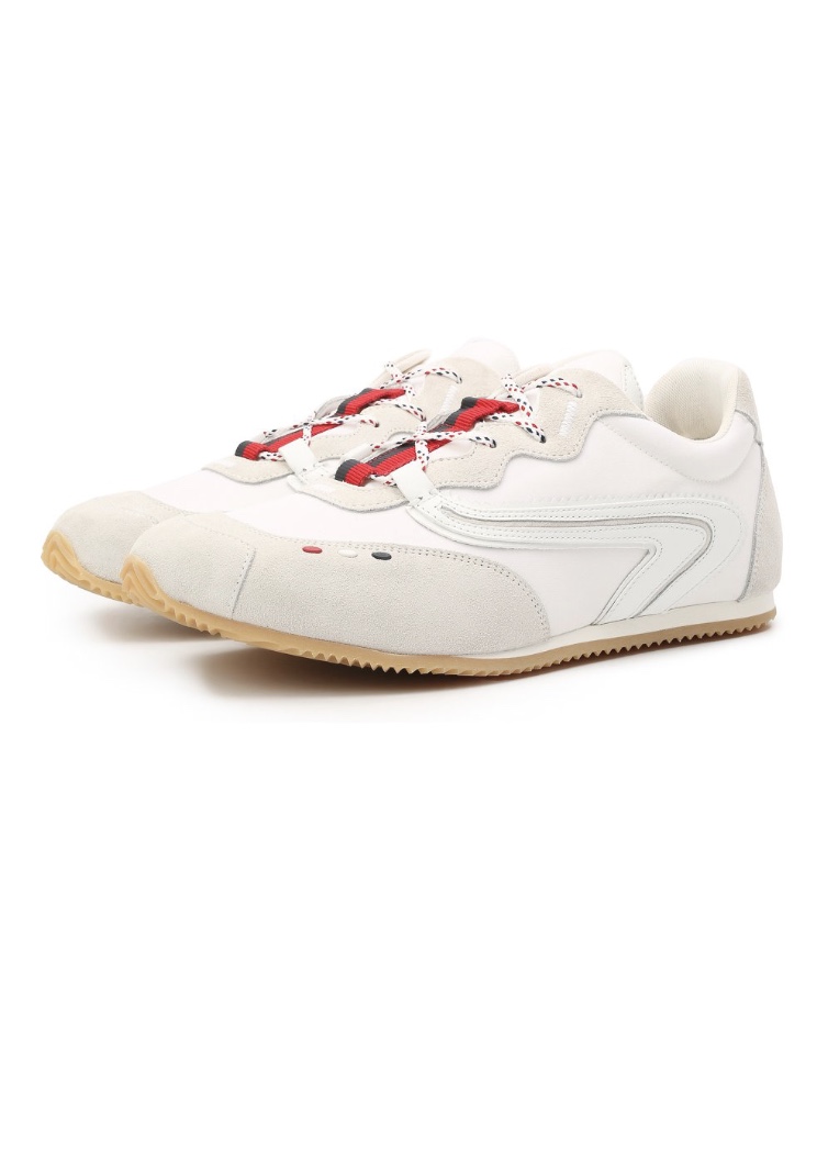 Модель,выполненная за счёт сочетания бархатистой замши,водостойкого нейлона и гладкой кожи,характеризуется шнуровкой,отделанной трёхцветной лентой,и дополняется шнурками,заимствованными у обуви для трекинга.