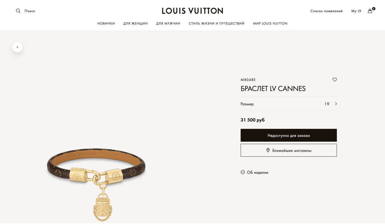 "В богатой коллекции аксессуаров Louis Vuitton представлен оригинальный браслет LV Cannes. Центральным элементом элегантного украшения служит подвеска в виде миниатюрной сумки Cannes с искусной гравировкой узора Monogram. Дизайн изящной подвески из полированного металла дополняет элемент в виде подвижной цепочки, которая служит плечевым ремнем у оригинальной версии сумки. Внимание к деталям, искусная гравировка узора Monogram и логотипа LV Circle подчёркивают безупречное мастерство Дома. Браслет из канвы Monogram имеет округлую форму снаружи и плоскую поверхность с кожаной подкладкой со стороны запястья, что делает его исключительно удобным."