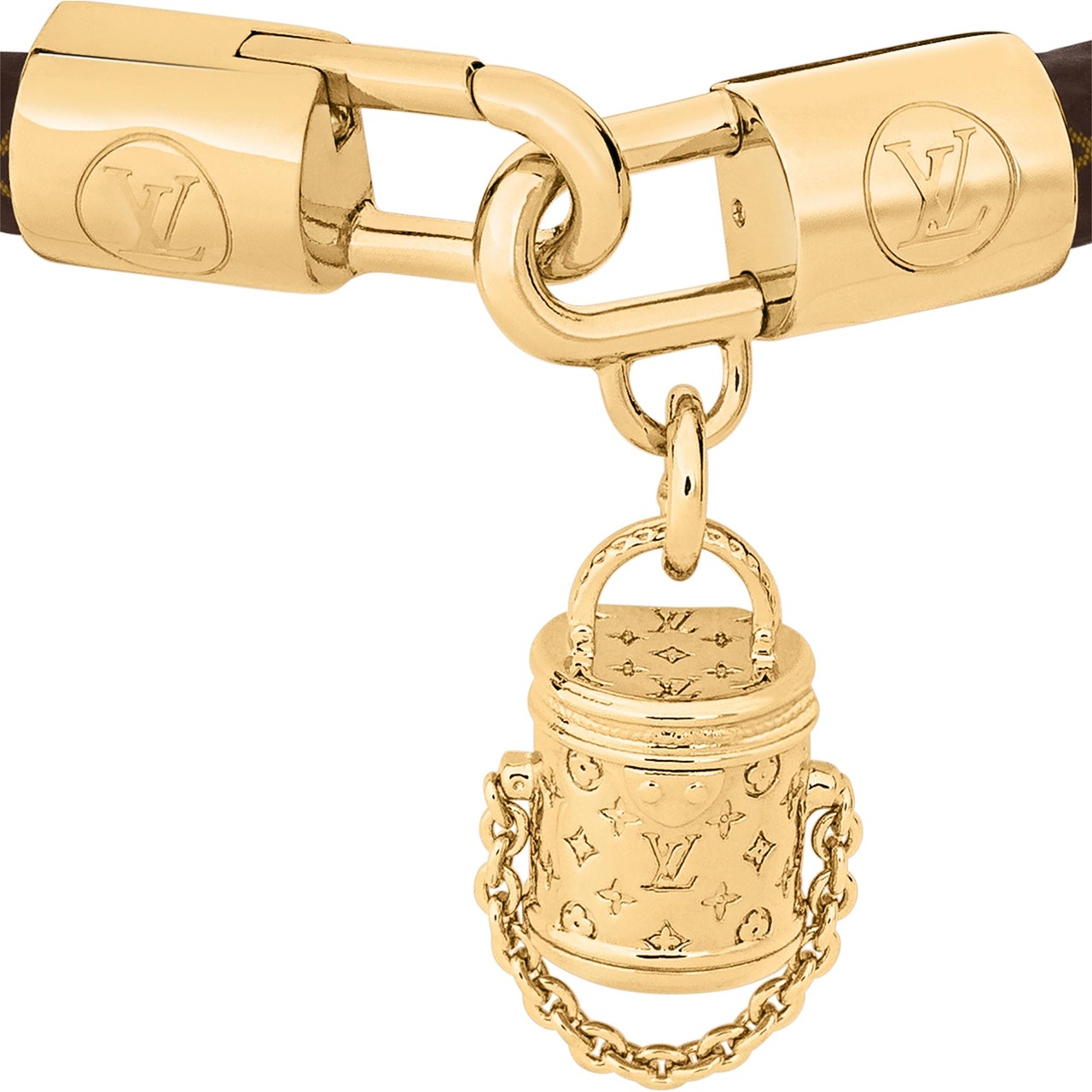 Коллекция-бестселлер постоянной линейки LV - браслеты из канвы Monogram, с подкладкой из кожи, украшенные подвижной подвеской в виде миниатюрной версии какого-либо символа бренда или одной из культовых сумок-икон Louis Vuitton.