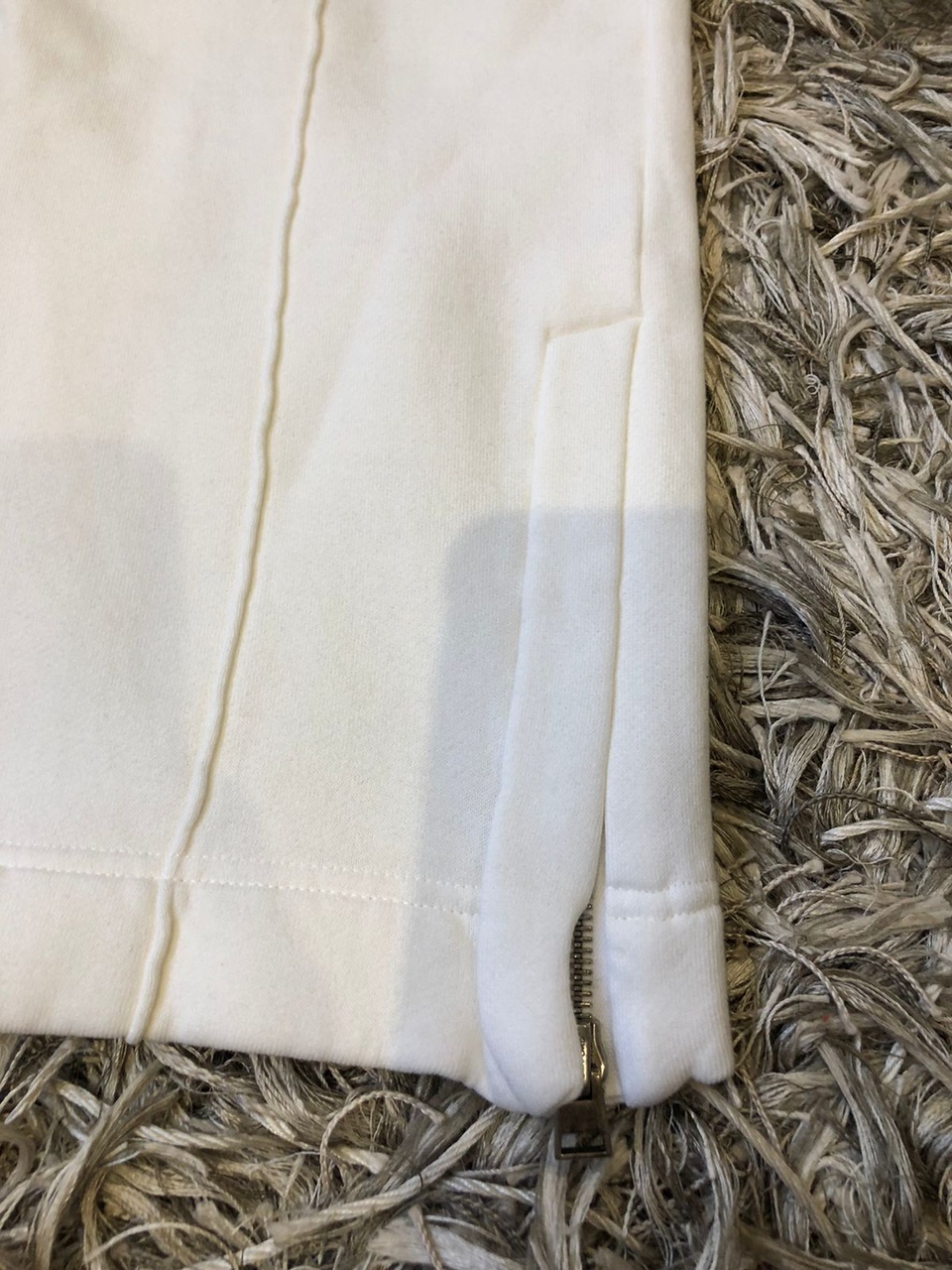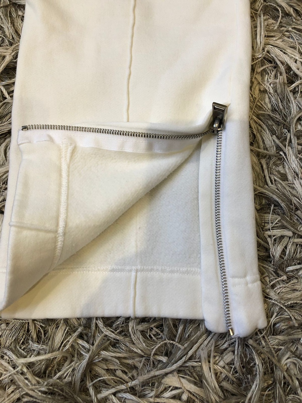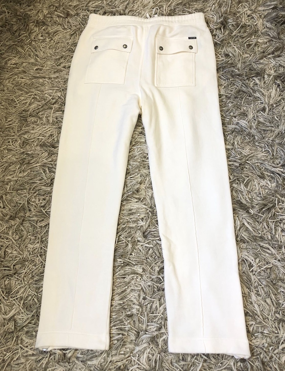 Брюки прямого кроя с фактурными,имитирующими стрелки швами,выполнены в спортивном стиле.Модель белого цвета изготовили из мягкого хлопкового трикотажа,что придаёт комфорт владельцу.Широкий пояс с кулиской,с помощью которого удобно регулируется посадка,крупные накладные карманы сзади,потайные молнии на низе брючин характеризуют данное изделие,идеально подходящее для путешествий и повседневной носки.