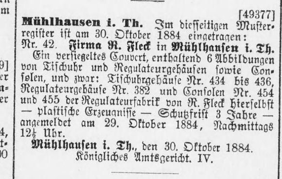 Die Firma R. Fleck beteiligten sich 1873 an der Weltausstellung in Wien. Im Ausstellungskatalog wurden folgende Angaben gemacht: Der Betreib R. Fleck wurde 1865 in Paris gegründet und errichtete 1868 in Mühlhausen / Thüringen einen Zweigbetrieb. Dieser wurde 1870 zum Hauptbetrieb. da der Betrieb in Paris vermutlich wegen des sich abzeichnenden Deutsch-Französischen Krieges geschlo werden musste. Im Jahr 1872 wurden 30 Arbeiter beschäftigt, von denen 6 unter 16 Jahren waren. Der Jahresumsatz wurde mit 35000 Talern angegeben.