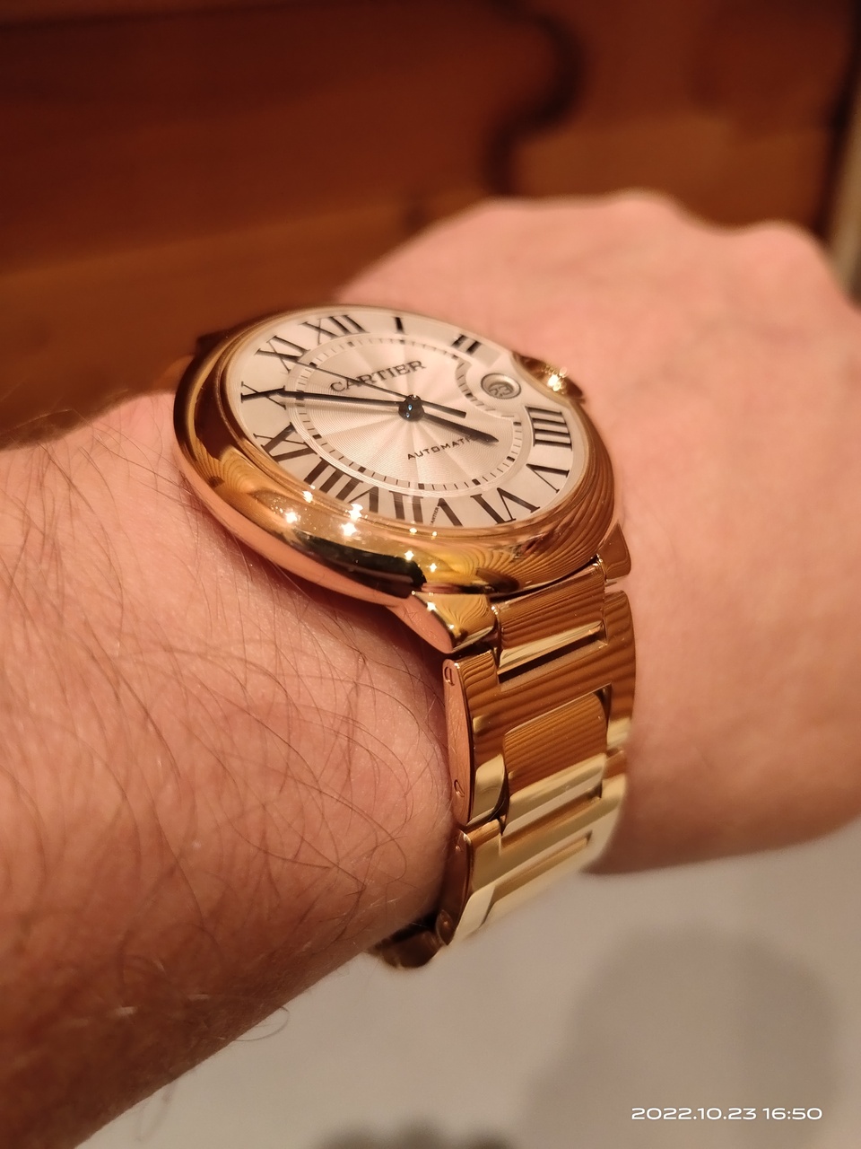 Мужские золотые элитные Cartier Ballon Bleu 42mm. С момента появления и до сегодняшнего дня остается самой популярной и востребованной среди всех часов Cartier! Шикарный эмалевый циферблат с узором солнечные лучи сквозь увеличивающее стекло-линзу не оставит никого равнодушным. Очень удобный корпус и золотой браслет. Общий вес 230 грамм!
