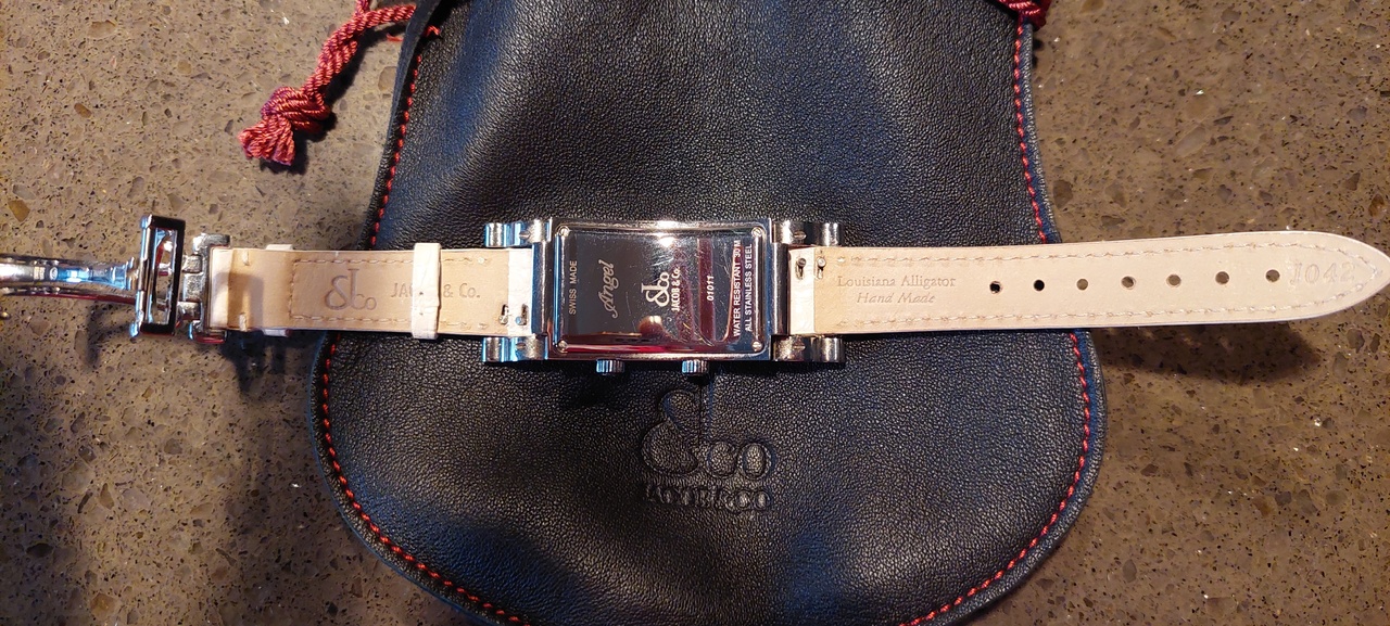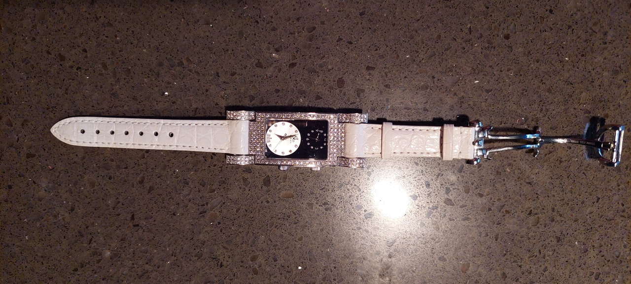 Jacob & Co. Angel Dual Time... Без брюликов такая модель весьма бюджетна... Порядка сотки в рублях. С брюликами можно просить и полтора лямя, но продастся ли... Для начала - к геммологу за экспертизой, ну а потом пробовать продавать... Но, история будет очень долгой. А ломбард или перекупщики желаемую цену не дадут. Думаю, рублей 200-300 максимум...