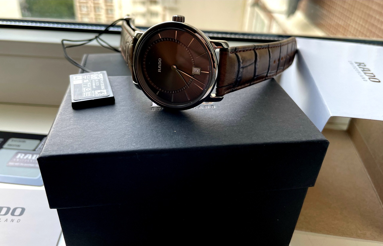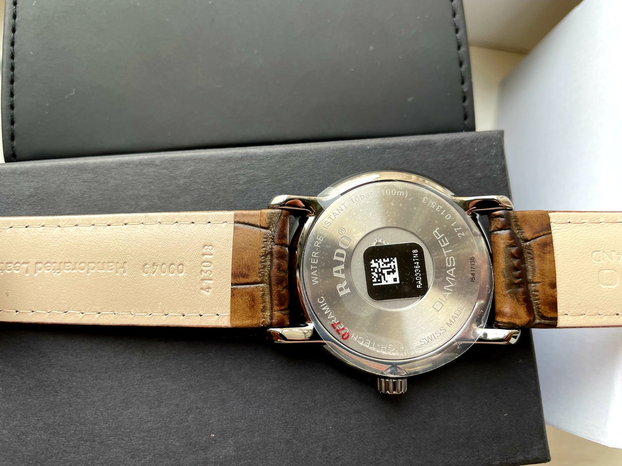 Кварцевый механизм, корпус выполнен из высокотехнологичной керамики с устойчивостью к появлению царапин, ремешок из натуральной кожи, изящный циферблат, водостойкость: 100 м. Диаметр корпуса: 40 мм, толщина: 8,4 мм. Срок службы батарейки: август 2025 года. Производство: Швейцария.