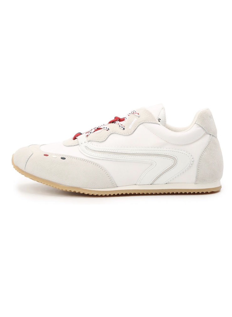 Модель,выполненная за счёт сочетания бархатистой замши,водостойкого нейлона и гладкой кожи,характеризуется шнуровкой,отделанной трёхцветной лентой,и дополняется шнурками,заимствованными у обуви для трекинга.