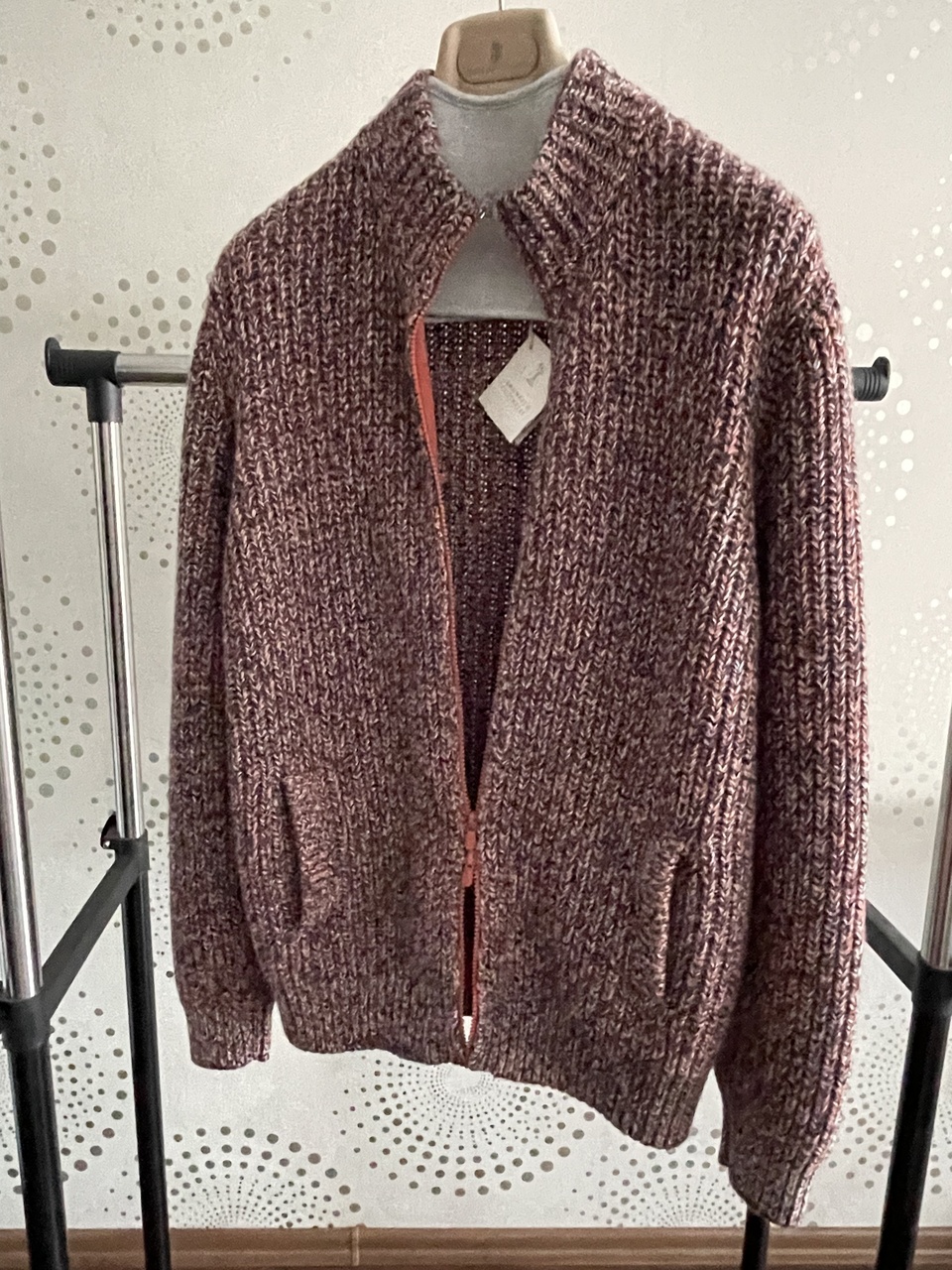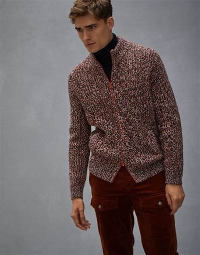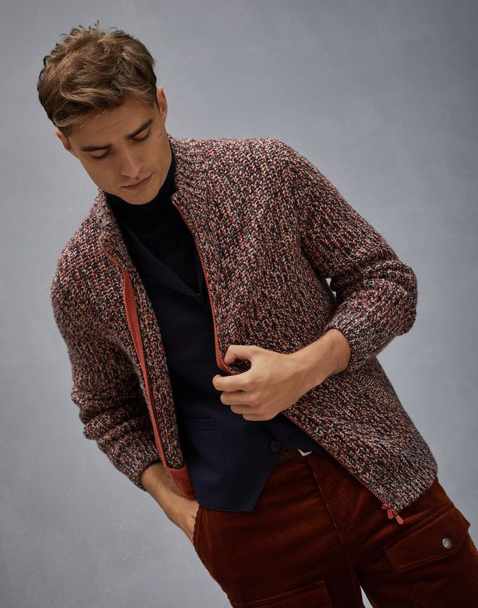 Современная техника вязки сочетается с традиционными трикотажными текстурами и ценными натуральными волокнами.Вязка полупатентной резинкой благородных волокон кашемира подчёркивает меланжевый эффект узорчатой пряжи.Окрашенные в разные оттенки нити создают особый меланжевый эффект,который выделяется на фоне классических линий кардиган. Высокий воротник, рукава реглан и застежка-молния с двойным бегунком завершают эту неформальную модель в спортивном стиле.