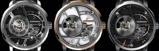 Оригинальный способ отображения времени заключается в применении двойного механизма со скачущим указателем часов и ретроградным указателем минут. Секундная стрелка находится на малом циферблате в положении "5 часов". Интригующие тяги, напоминающие, как особо подчеркивает Рено де Ретц, об эпохе паровозов, приводят в движение скачущий диск часов. Когда минутная стрелка достигает отметки 60, под воздействием центральной спиральной пружины одна из тяг взводит небольшую пружину с инерционным грузом, который, в свою очередь, поворачивает диск указателя часов. Баланс часов совершает 21 600 полуколебаний в час, а запас хода составляет 40 часов. Задняя крышка с сапфировым стеклом на винтах позволяет следить за работой чудо-механизма.