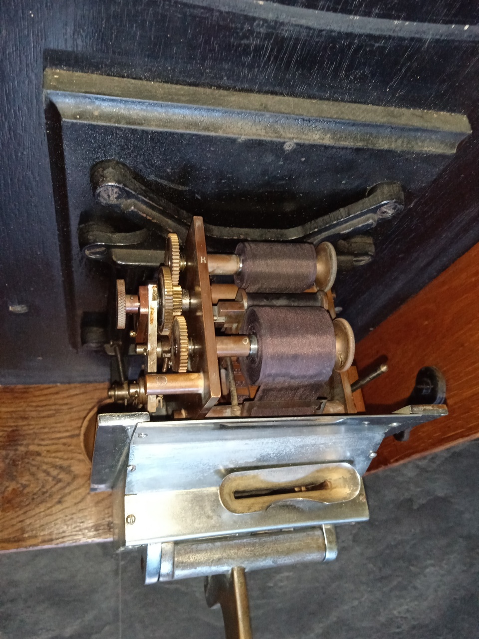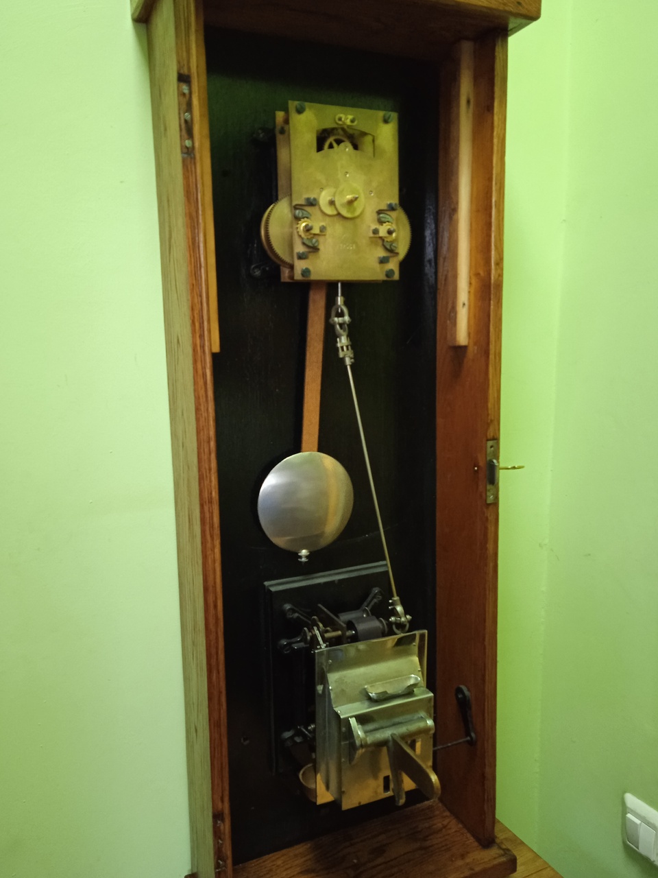 Приветствую, форум. Довелось мне пообщаться с такими вот интересными часиками. Механизм с двумя мощными заводными барабанами, которые двигают и стрелки и через карданный вал колёса календарного механизма (на карточке печатаются минуты, часы и день недели). Всё было в очень грязном! состоянии (наверное, часы висели на проходной литейного цеха), но после обслуживания всё заработало отлично.