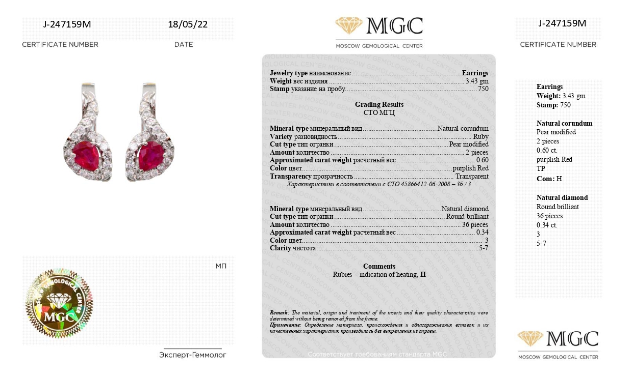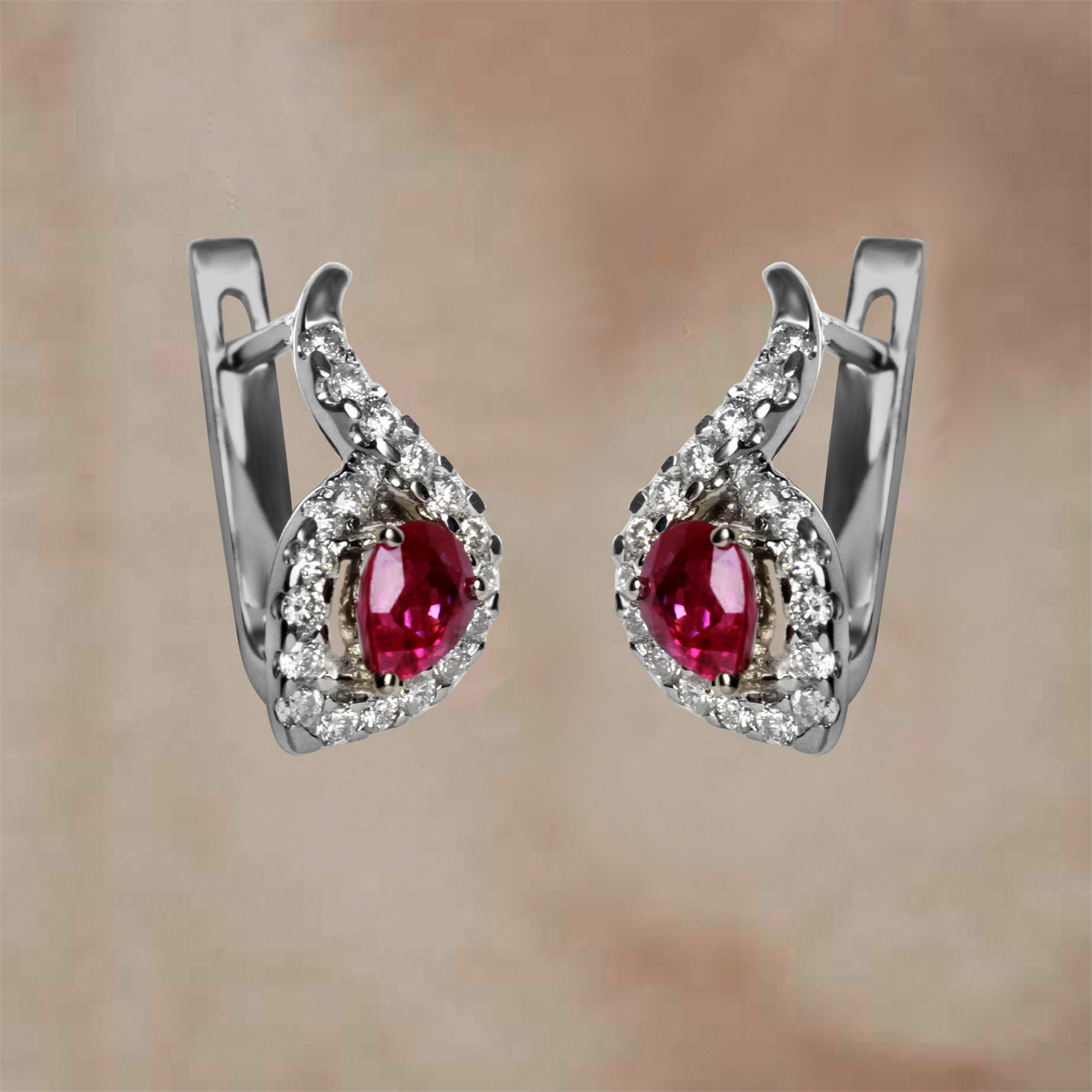 Серьги из белого золота с рубинами 0,6 карат и бриллиантами 0,34 карат (сертификат МГЦ)