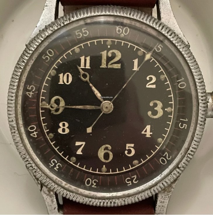 Seiko ‘Tensoku’ or ‘Tensoku-Dokei’ (天測時計 in Japanese – which translates directly to ‘celestial clock’), a classic, sizable, big crown pilot watch from the WWII era – made by Seiko for Japanese pilots. The Seiko Tensokus were large timepieces, produced by Seikosha, that measured 48.5 mm in diameter and were originally powered by modified, manual winding 15-jewel pocket watch movements that were later downgraded to 9 jewels. They had radium paint on the dial at 3, 6, 9, and 12 o’clock, a bi-directional rotating bezel, and nickel-plated cases. Virtually all the hallmarks of a WWII pilot’s watch and very similar in style to Flieger watches!