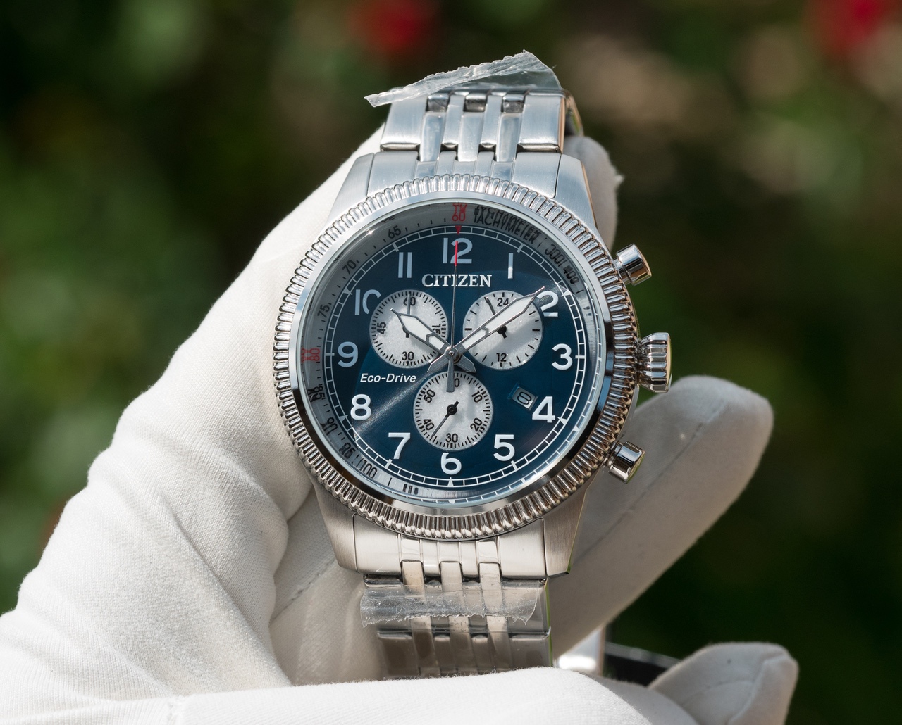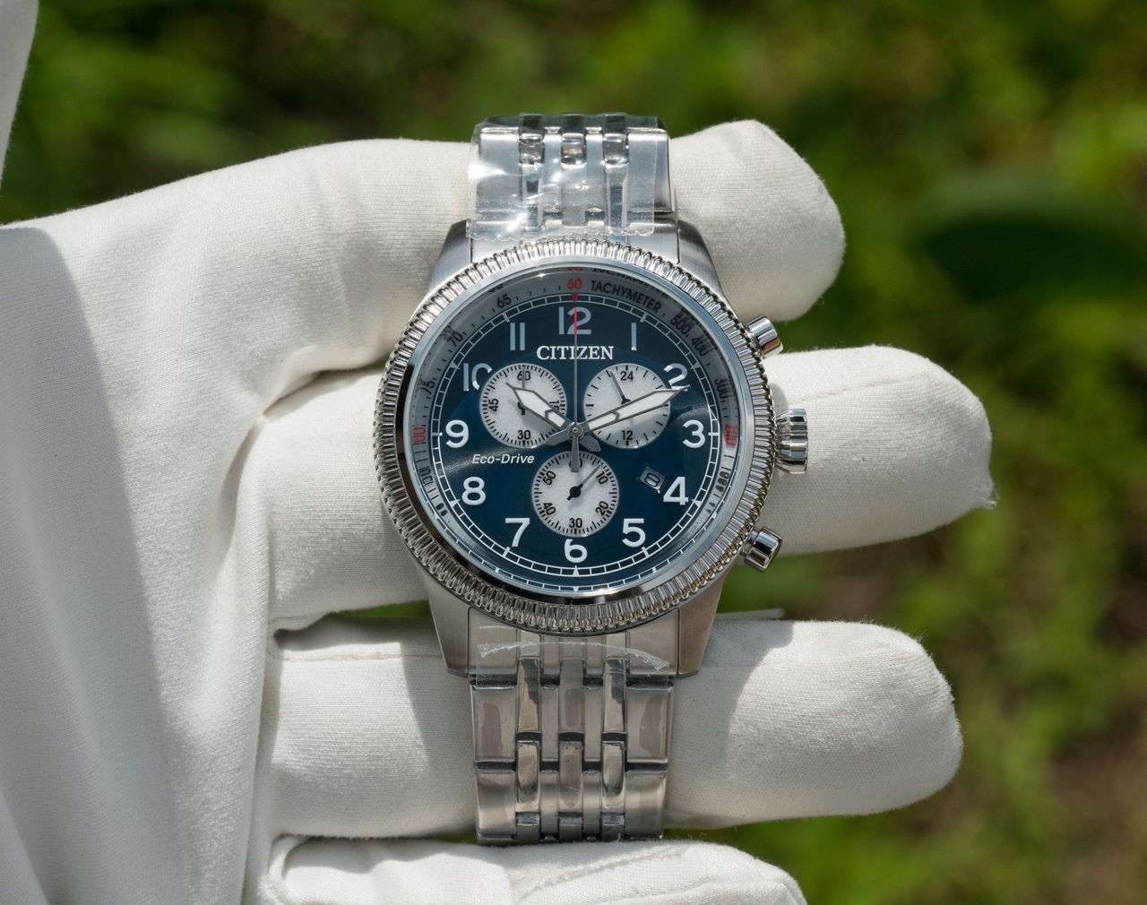 Темно-синий циферблат, санберст - сатинирование расходящиеся лучами от центра, часы "играют" на ярком свету
