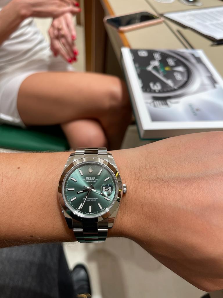 Позвонил своему менеджеру в апреле, сказал что хочу либо их, либо wimbledon dial, но больше все-таки Mint Green dial. Она как обычно немного скептически ухмыльнулась, но сказала постарается.