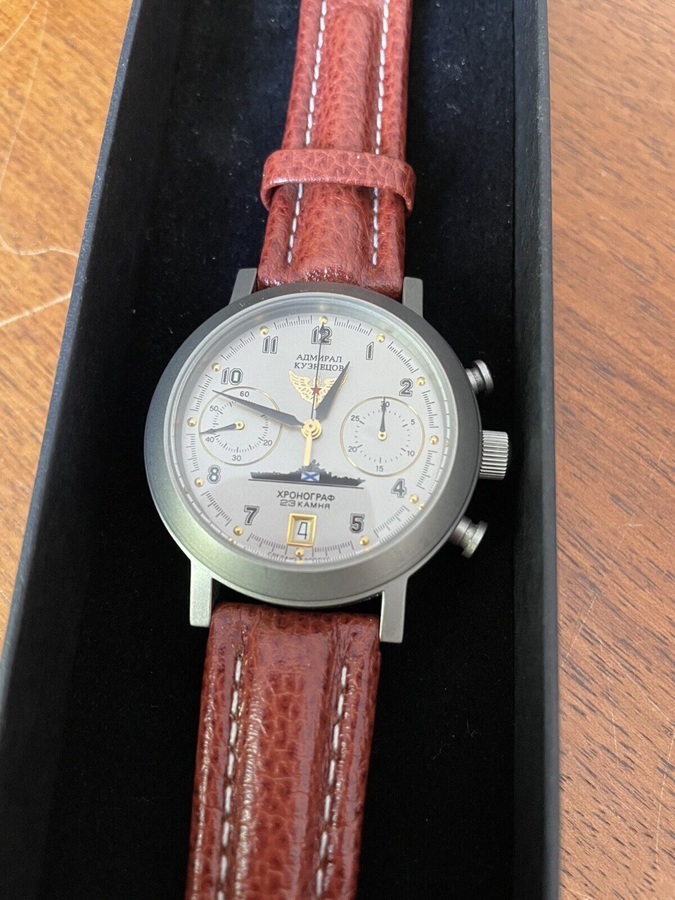 Неизвестные титановые часы (хронограф, 23 камня, авианосец "Адмирал Кузнецов", Сделано в России)