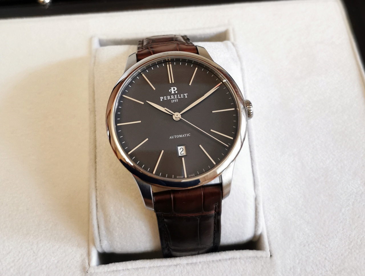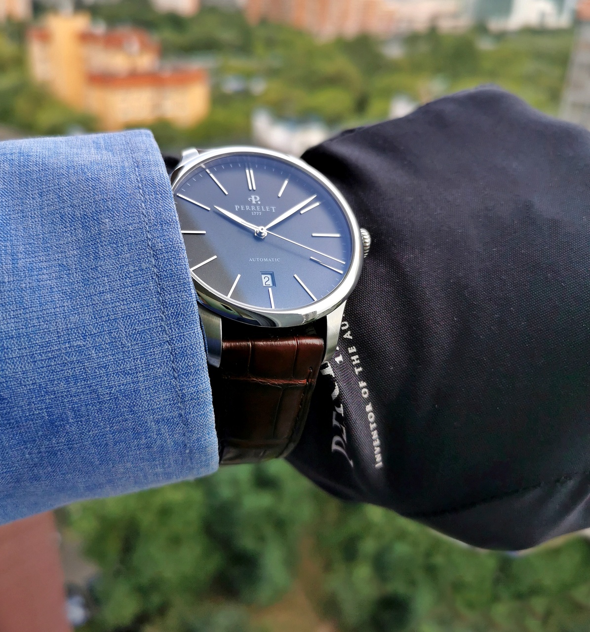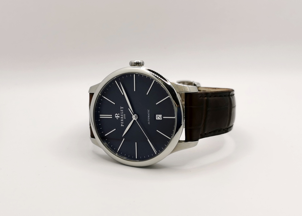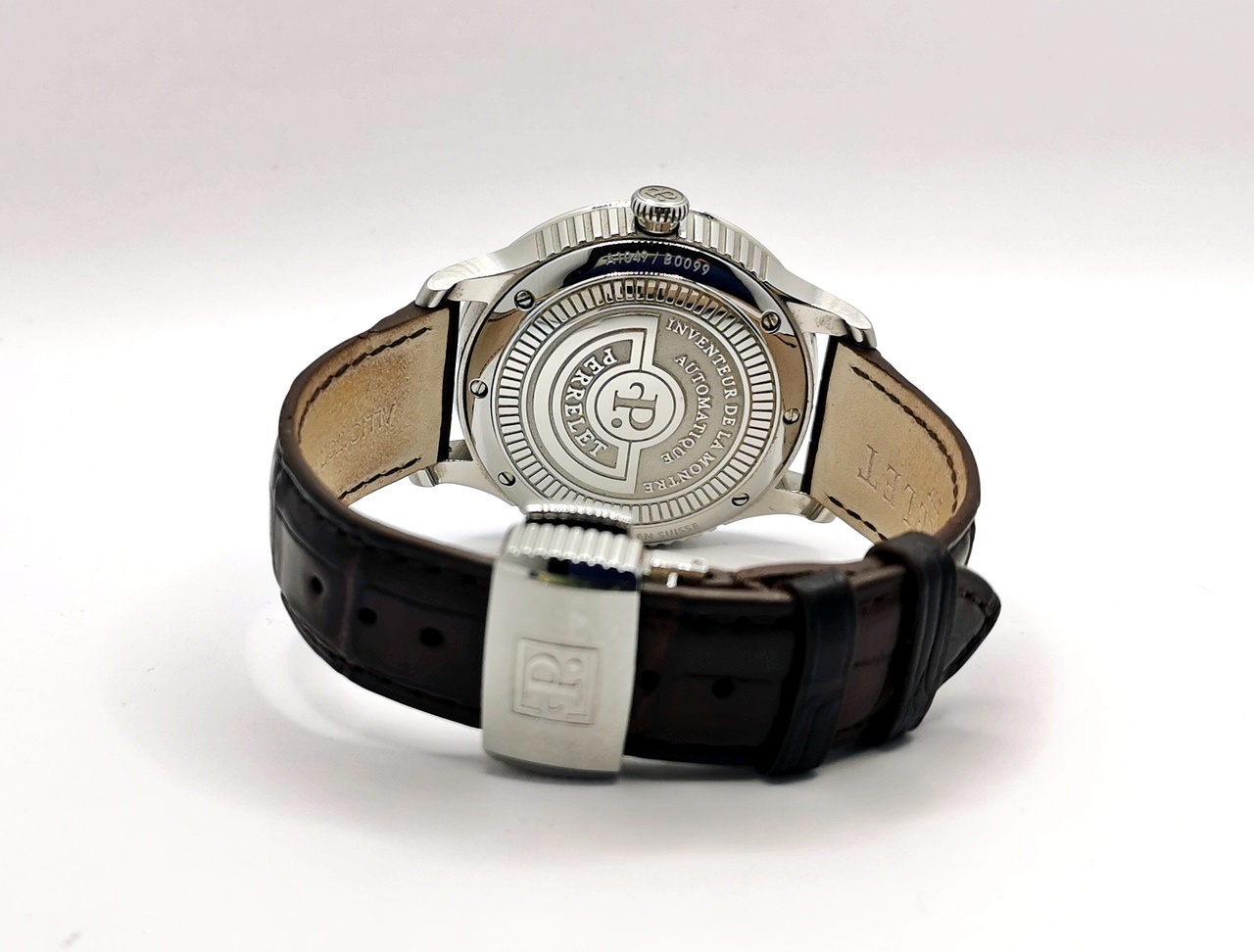 Мужские часы Perrelet First Class заметно отличаются от остальных моделей этого семейства. Отличия заключаются в более классическом и утонченном исполнении. Строгий дизайн подчеркивает их сдержанный и целостный характер. Изысканный аксессуар выполнен в корпусе из нержавеющей стали размером 42,5 мм и толщиной 10,6 мм. Тонкие серебристые стрелочки отлично смотрятся на графитовом фоне циферблата в сочетании с ремешком из кожи аллигатора тёмно-коричневого цвета. Часы с механическим калибром и с автоподзаводом. Вся красота часов надежно скрыта от механических повреждений, влаги, пыли и прочих неблагоприятных условий под сапфировым стеклом и прочной стальной задней крышкой. Изящный образ эксклюзивных часов дополняет раскладывающаяся стальная застежка и кожаный ремешок из аллигатора.