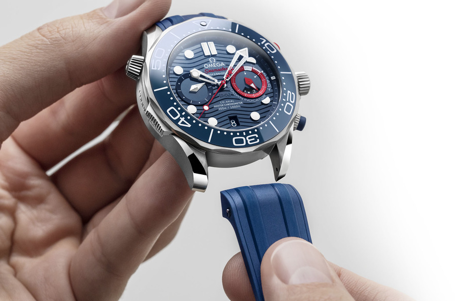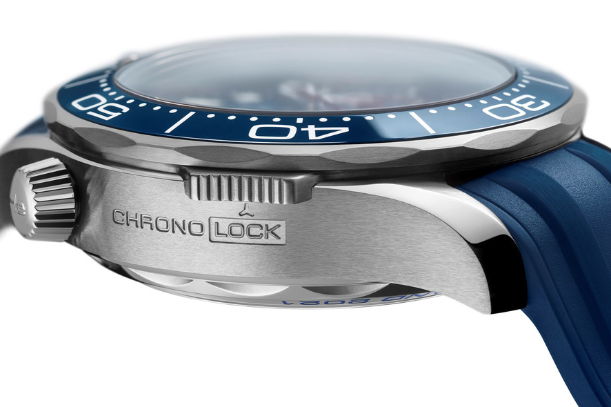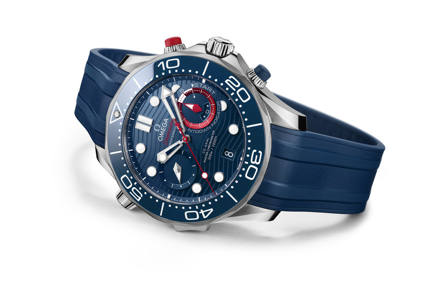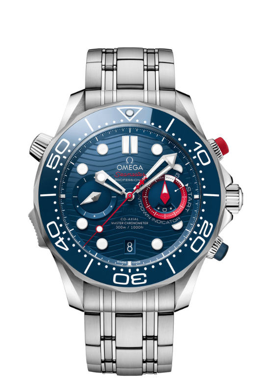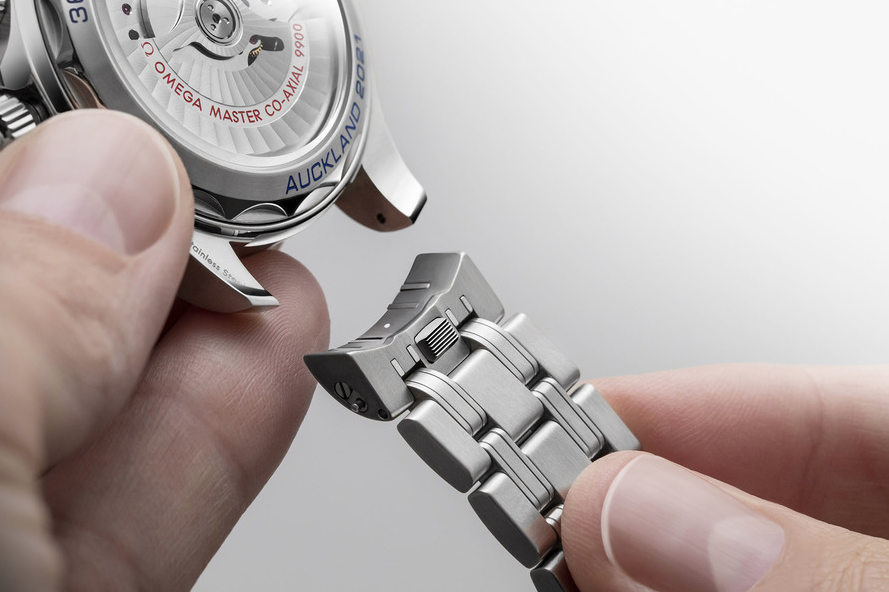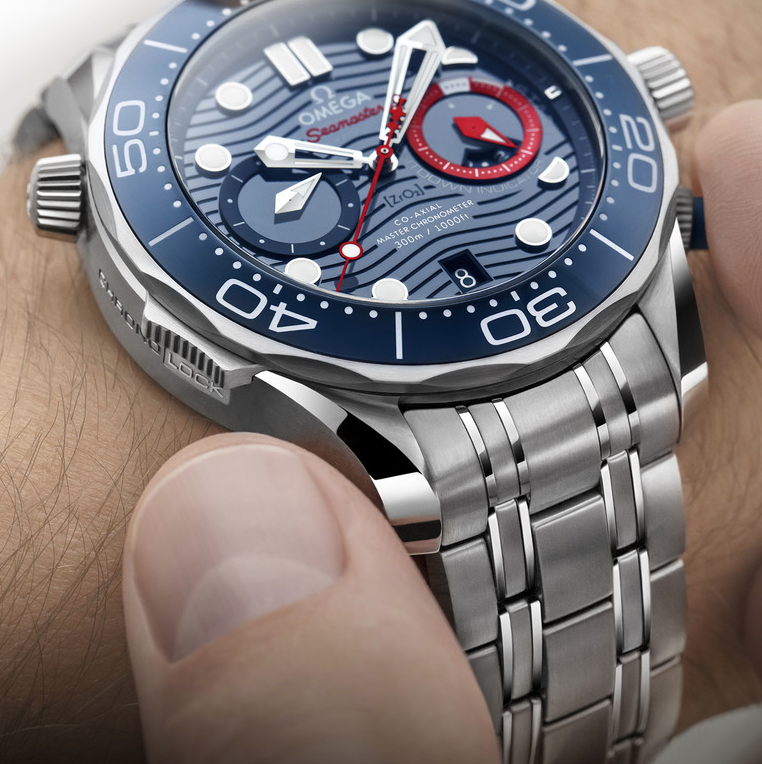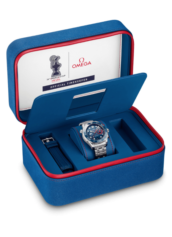 Omega Seamaster Diver 300m America's Cup Chronograph – это оригинальная новинка, которую оснастили специальными функциями для регаты. Стальной корпус в диаметре составляет 44 мм. «CHRONO LOCK» - скользящая кнопка на «8 часах», которая защитит функции хронографа и позволит избежать случайных измерений. Циферблат из керамики синего цвета украшен лазерной гравировкой с характерным волновым узором и новыми красными элементами. Дополнительный счетчик на отметке «3 часа», который включает минуты и часы, теперь оснастили кольцом индикатора обратного отсчета регаты из алюминия красного цвета. Часы поставляются с браслетом из нержавеющей стали и ремешком из каучука синего цвета, и оба имеют пуговицу на спине. Простое нажатие на кнопку освобождает штифты от головки часов, позволяя владельцу легко переключаться между браслетом и ремешком. Под специально декорированным корпусом с гравировкой «36-й Кубок Америки» и «Окленд 2021» находится калибр 9900, который заводится автоматически и работает до 60 часов.