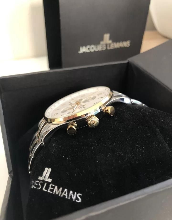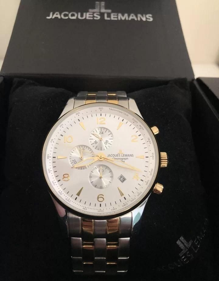 Оформление: На широком циферблате белого цвета расположены дополнительные индикаторы: 24-х часов, 30-минутный накопитель, дата, функция остановки/запуска хронографа. Риски удачно сочетаются с арабскими цифрами. Для декора некоторых элементов модели используют PVD-покрытие из желтого золота.