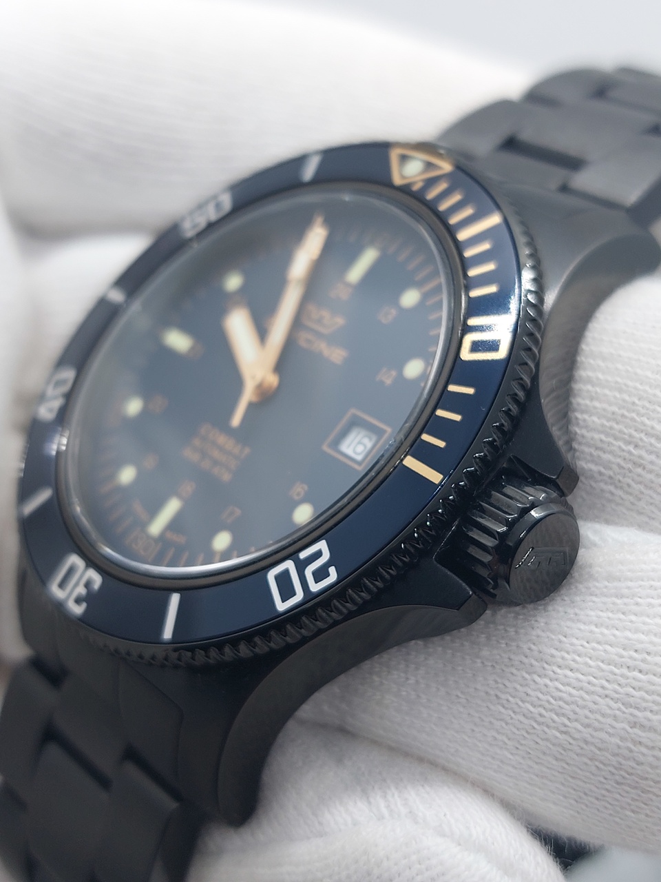 Однонаправленный вращающийся безель с PVD покрытием черного цвета с темно-синим алюминиевым кольцом.