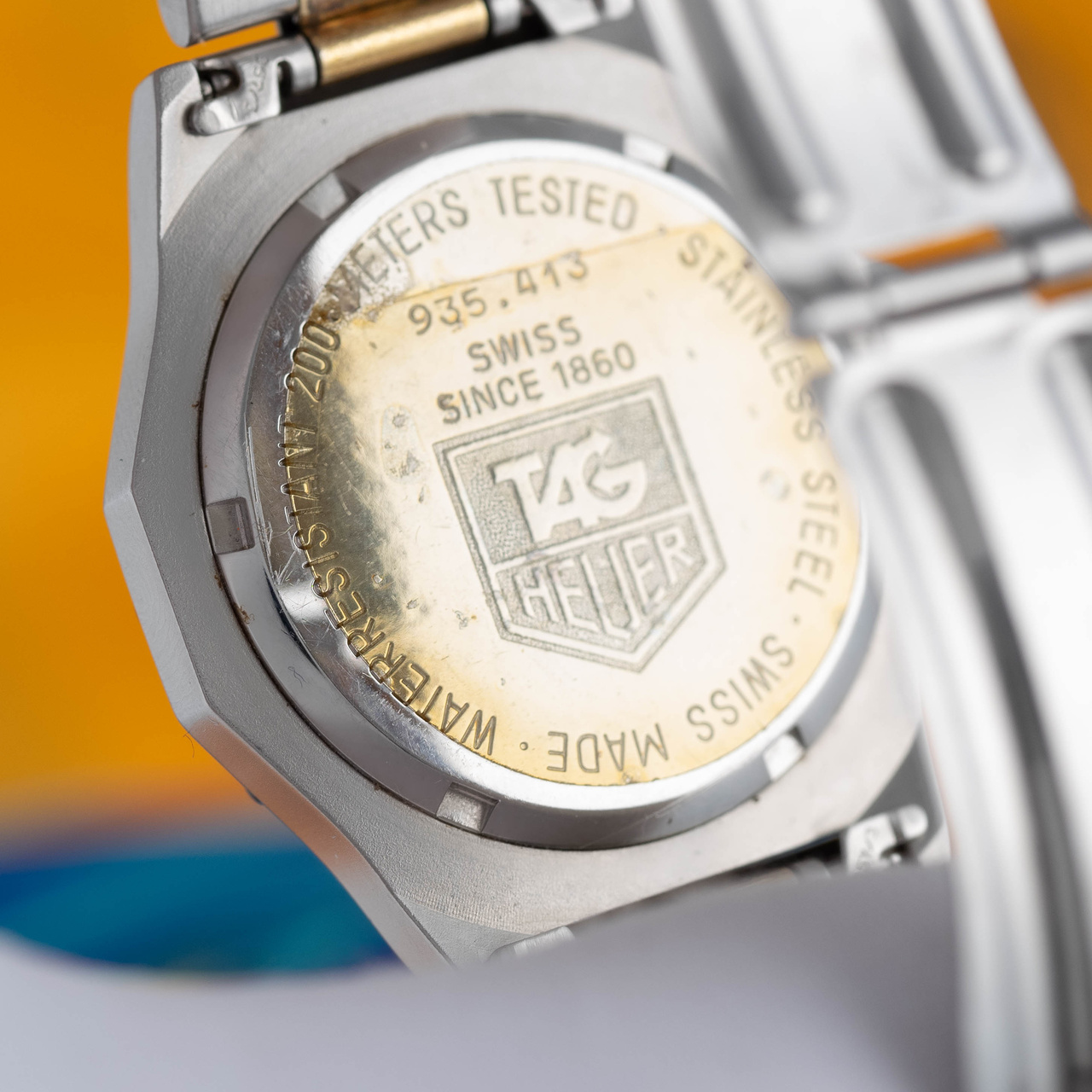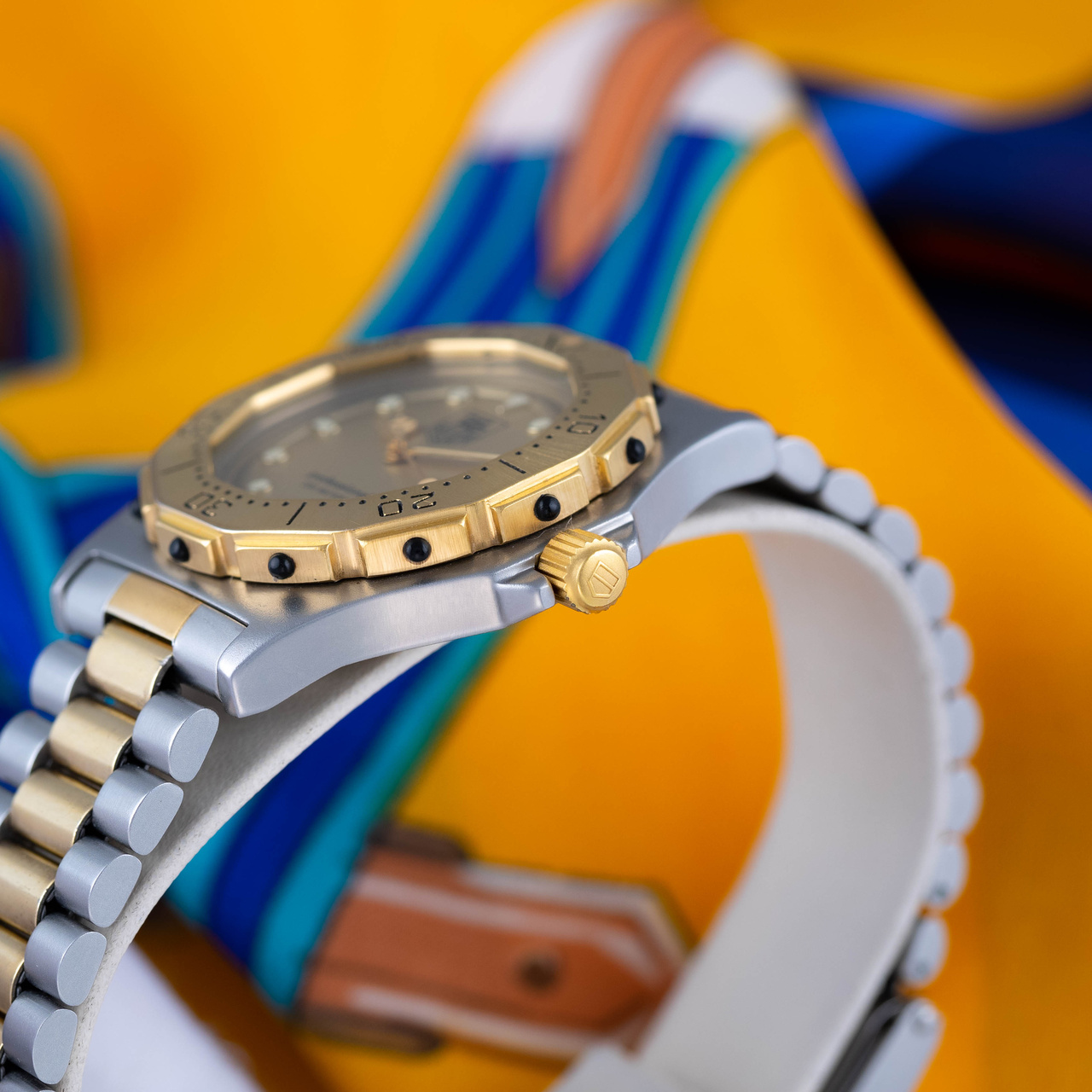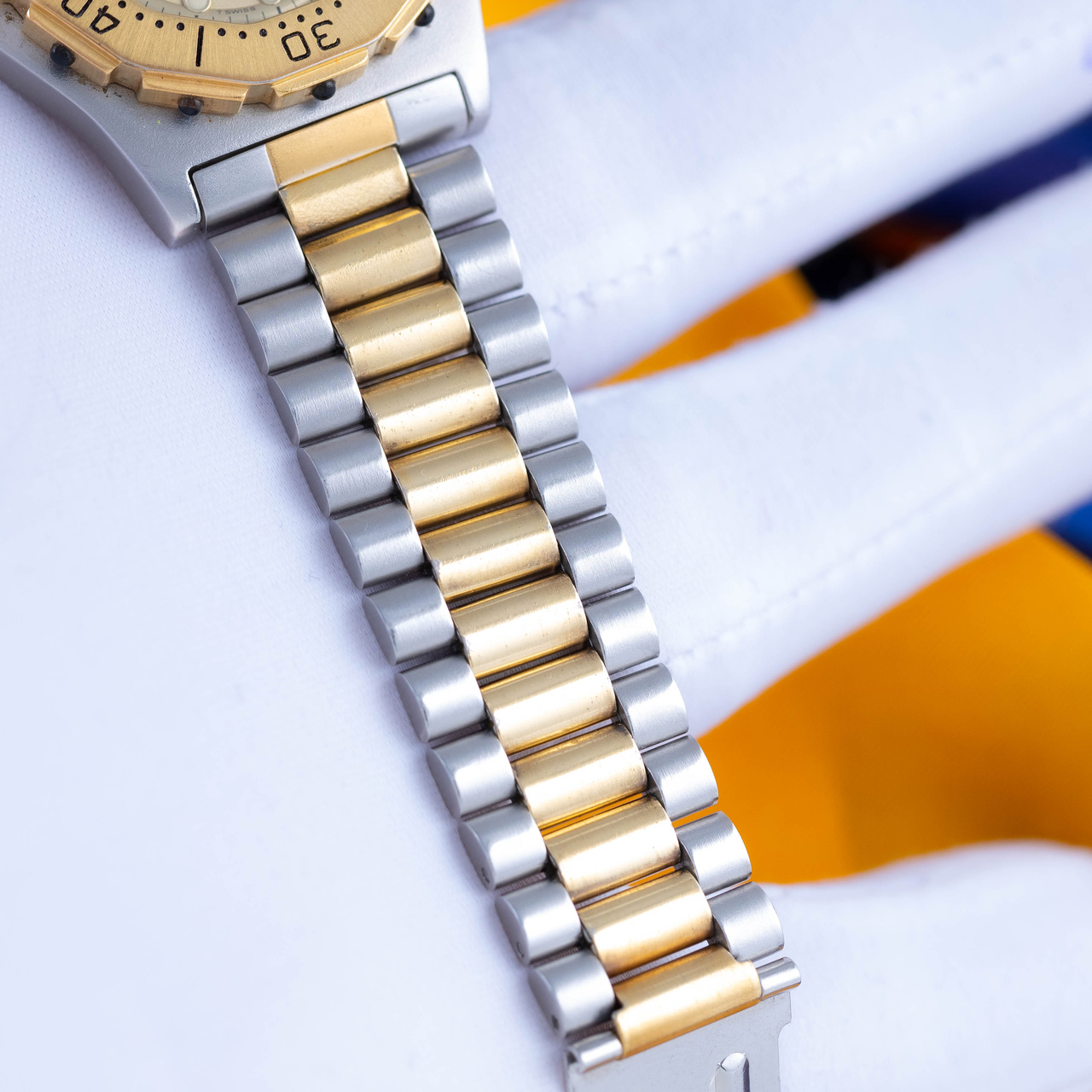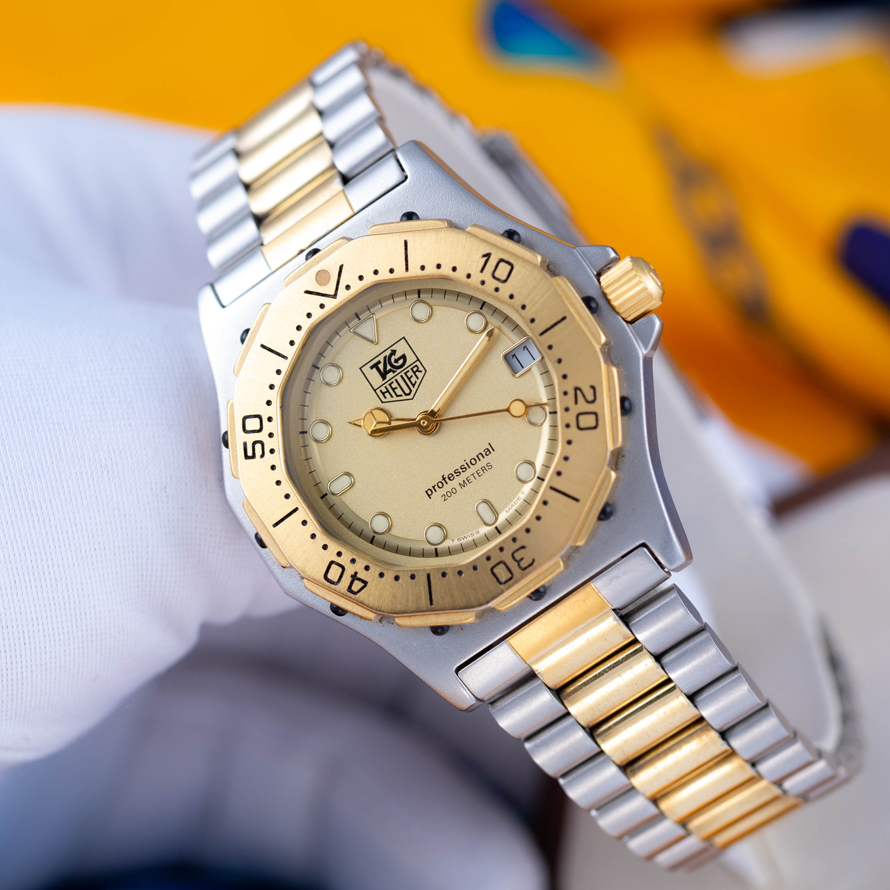 TAG Heuer 3000 series Professional - превосходное изделие швейцарских мастеров-часовщиков TAG Heuer. Для тех, кто этого не знает, дом был основан в 1860 году Эдуардом Хойером в Сент-Имье, Швейцария,а в 1985 произошло слияние с холдингом TAG,после чего компания получила название TAG Heuer. В данной модели часов по-прежнему использовались некоторые ключевые элементы, характерные стилю часов для дайвинга предыдущих десятилетий, а именно: односторонне крутящийся безель, люминесцентные метки на циферблате золотого цвета, завинчивающаяся заводная головка и стрелка в стиле Mercedes-Benz.