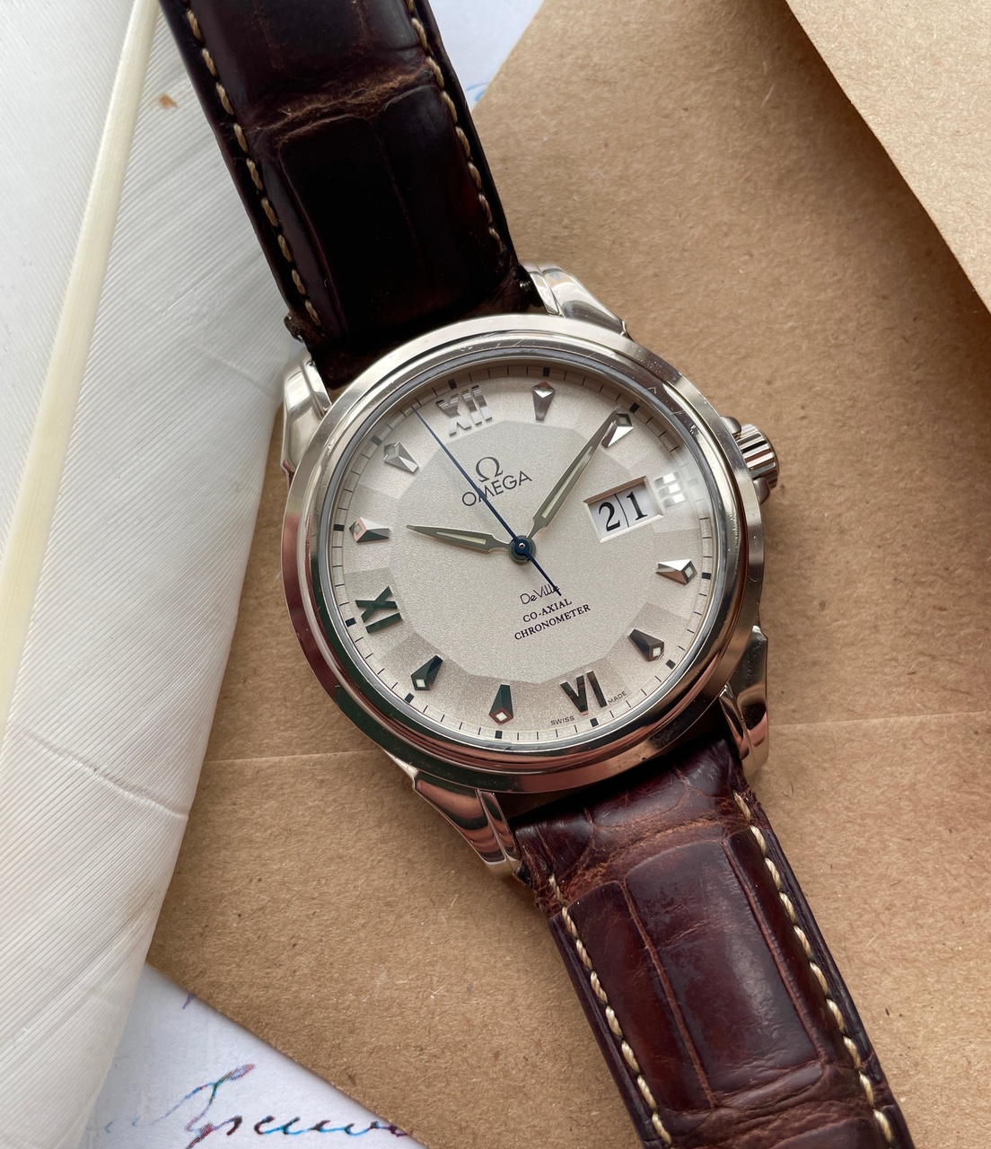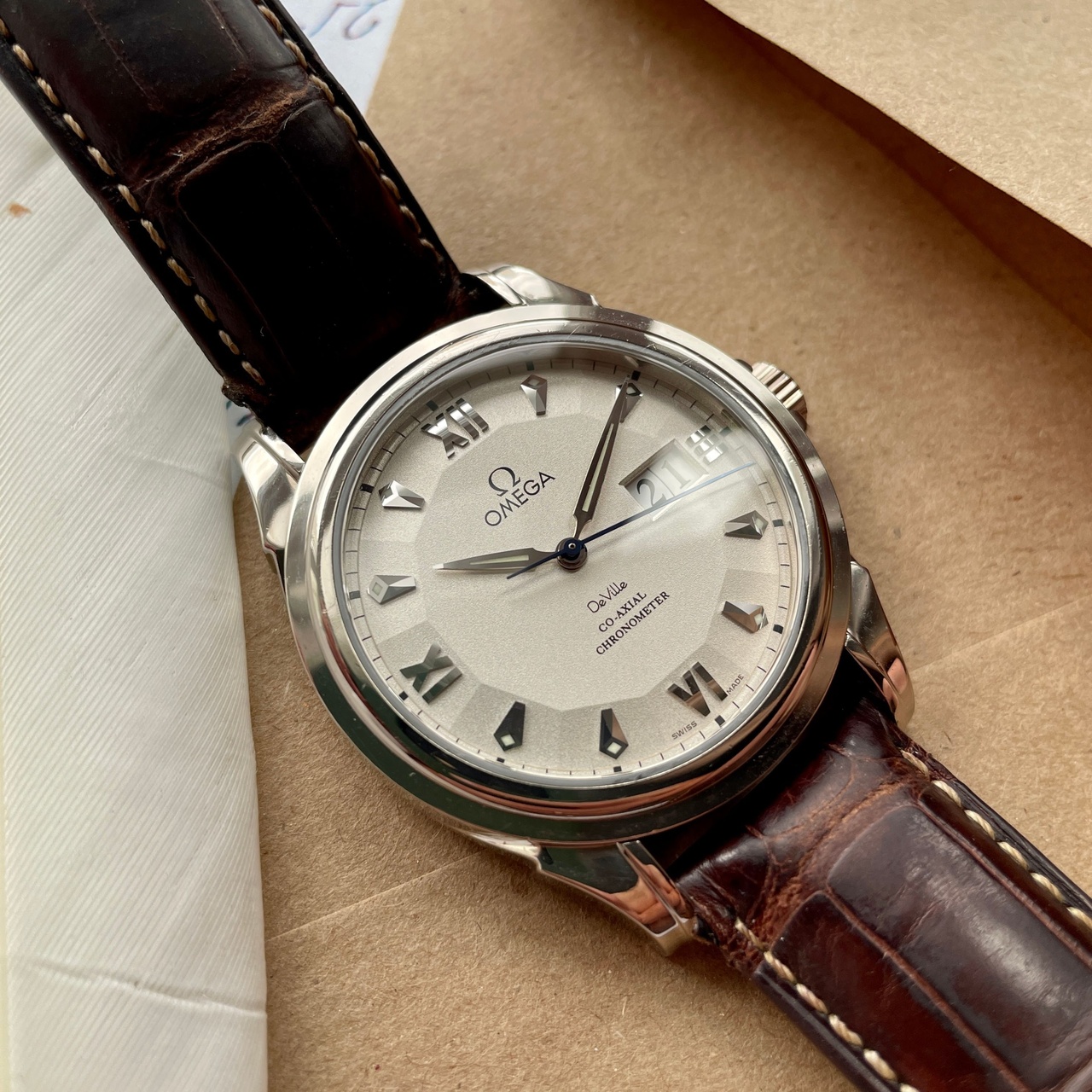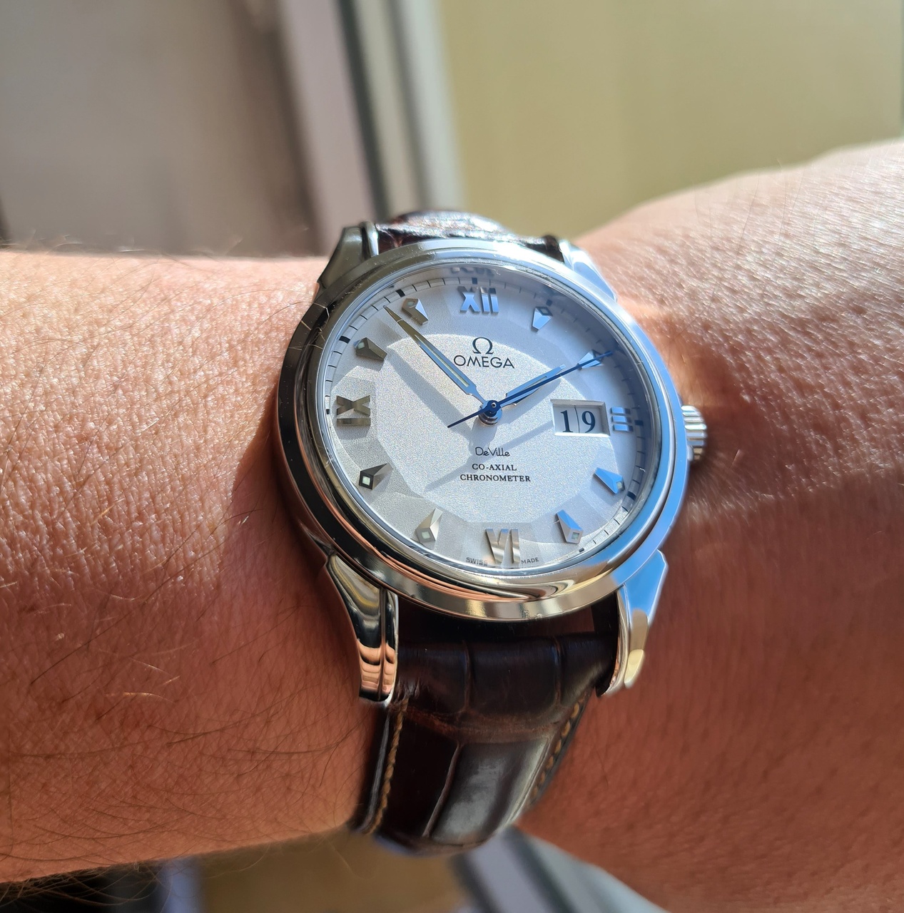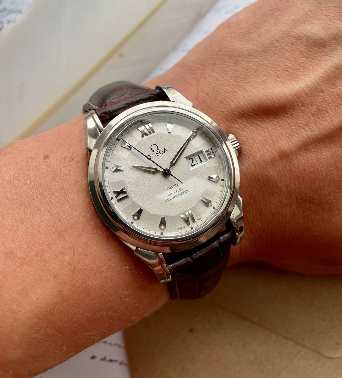 Роскошный циферблат с выпуклым 12ти угольником, перекочевавшим в новейший Globemaster. Интересен не только оттенок слоновой кости, но и исполнение циферблата в технологии кристалик, когда мельчайшие частицы не только играют на свету, но и делают циферблат не просто гладким, а глубоким и обьемным.