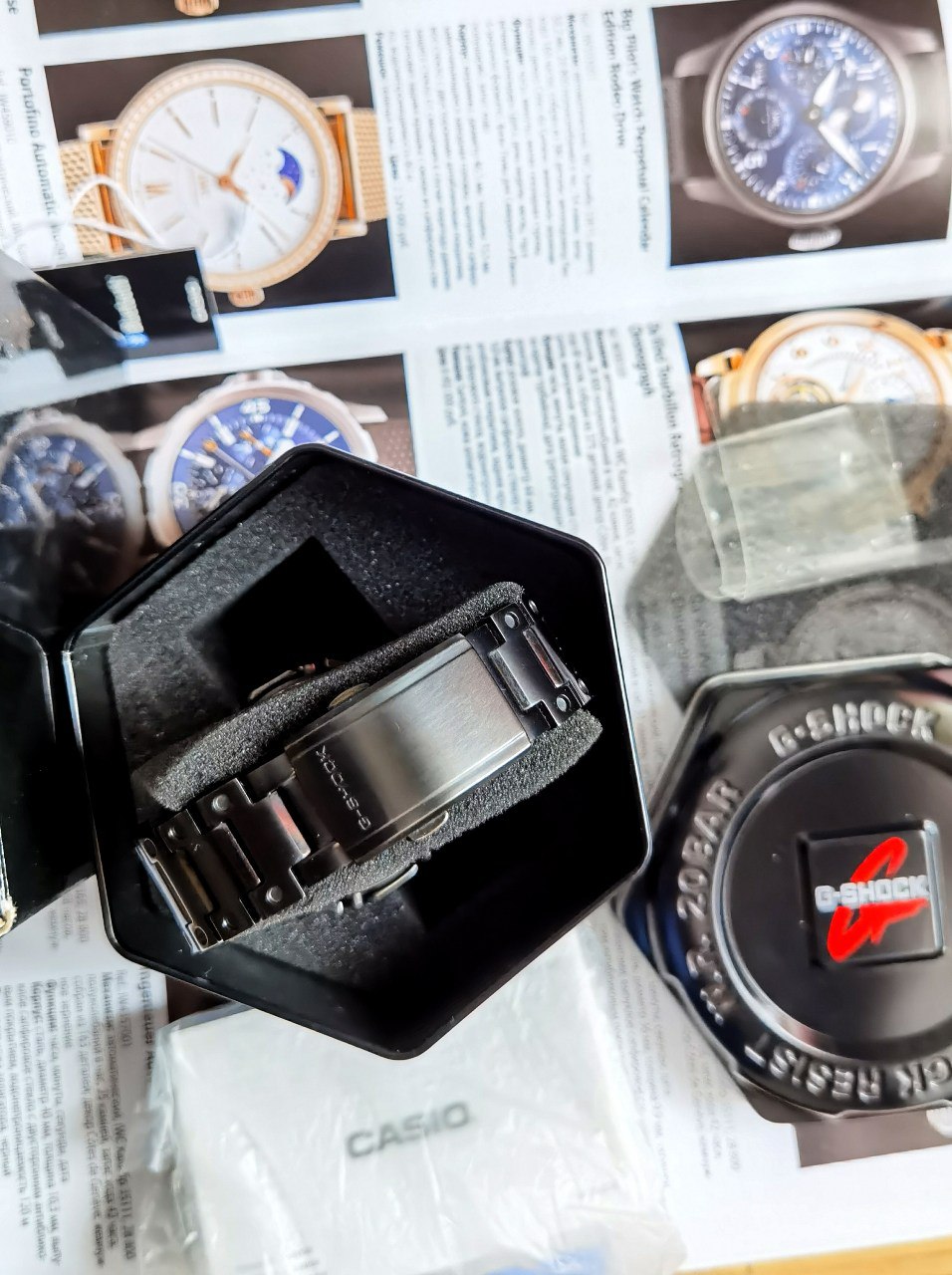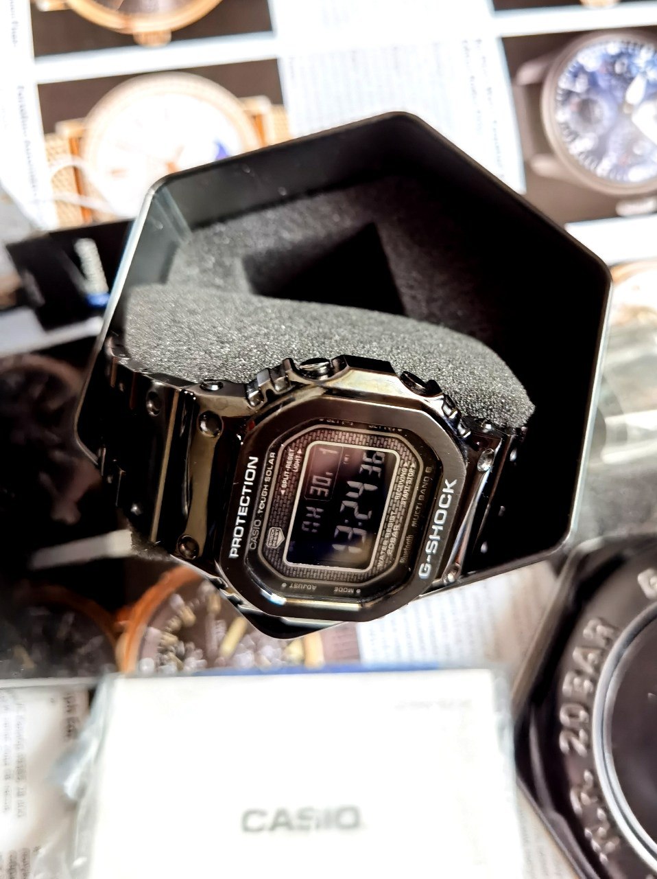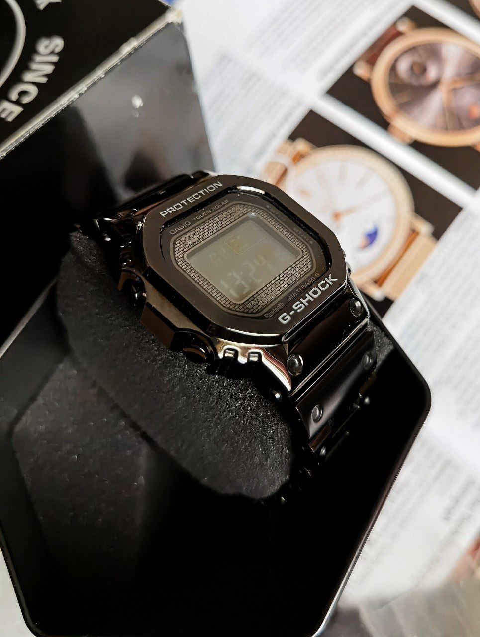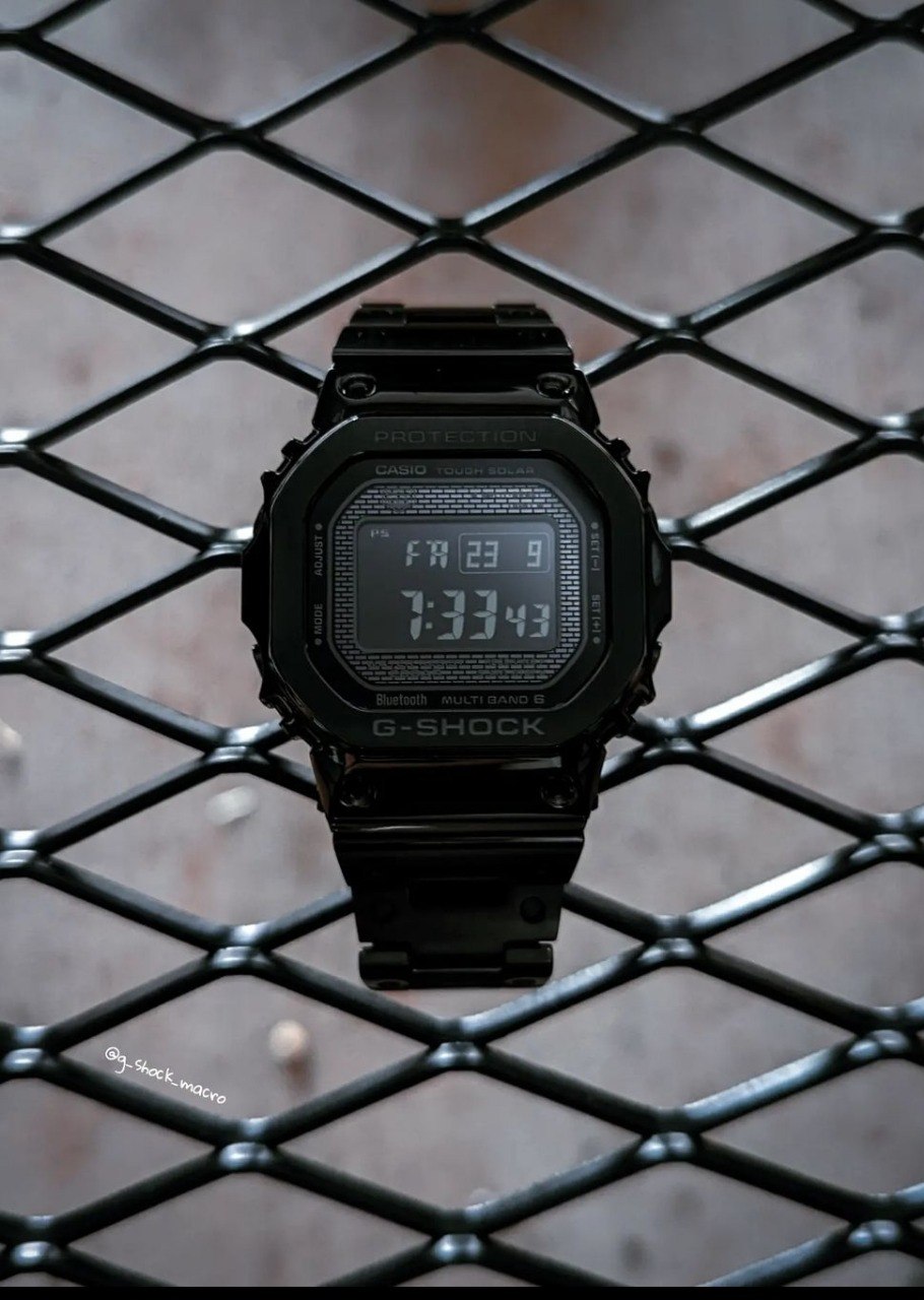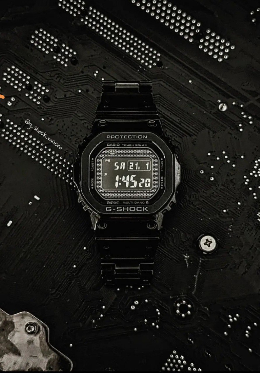 Браслет и корпус полностью выполнены из стали с сохранением всех прочностных характеристик, которыми могут похвастаться джишоки. Серия GMW-B5000 задумана японцами как дань уважения DW-5000 — самым первым в истории G-Shock-ам. Дизайн циферблата спроектирован таким образом, чтобы максимально точно повторить внешний вид оригинала. Между металлическим безелем и корпусом есть плотная полиуретановая прокладка, выполняющая роль демпфера при сильных ударах и вибрациях. Усиленное крепление браслета с прочными штифтами и дополнительными выступами улучшают его надежность. Электронный дисплей выполнен по технологии STN — теперь с лучшей читаемостью при любом угле обзора. Автоматическая коррекция времени производится двумя способами — радиосинхронизация и Bluetooth-соединение со смартфоном. Все настройки часов доступны на экране телефона в специальном приложении G-Shock Connect — теперь не нужно разбираться с функциями кнопок.