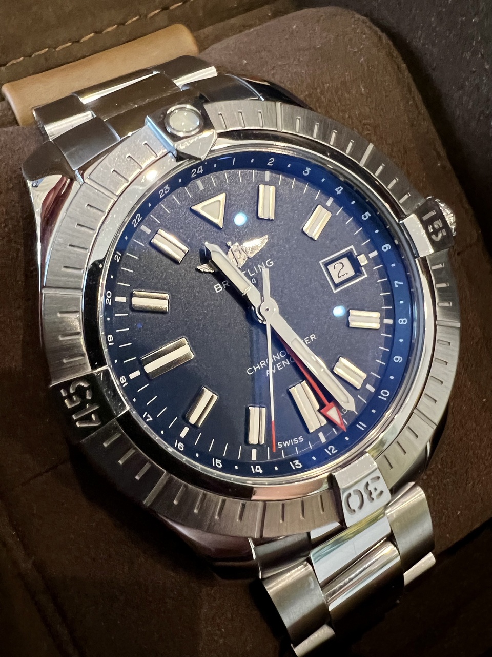 Смелый дизайн, чрезвычайно прочная конструкция и ударопрочность стали отличительными чертами модели Avenger Automatic GMT 45 с дополнительной красной стрелкой для индикации второго часового пояса. Будучи настоящим представителем семейства Avenger, эти часы Breitling подходят для ношения с перчатками и гарантируют пилоту-любителю беспрецедентный уровень безопасности и надежности. Модель Avenger Automatic GMT 45 обладает прочным корпусом из нержавеющей стали диаметром 45 мм, голубым циферблатом и браслетом из нержавеющей стали либо армейским кожаным ремешком голубого цвета с классической или раскладной застежкой из нержавеющей стали. Благодаря наличию массивного безеля и особой формы головки подзавода манипуляции с часами Avenger Automatic GMT 45 можно удобно выполнять, не снимая перчатки.
