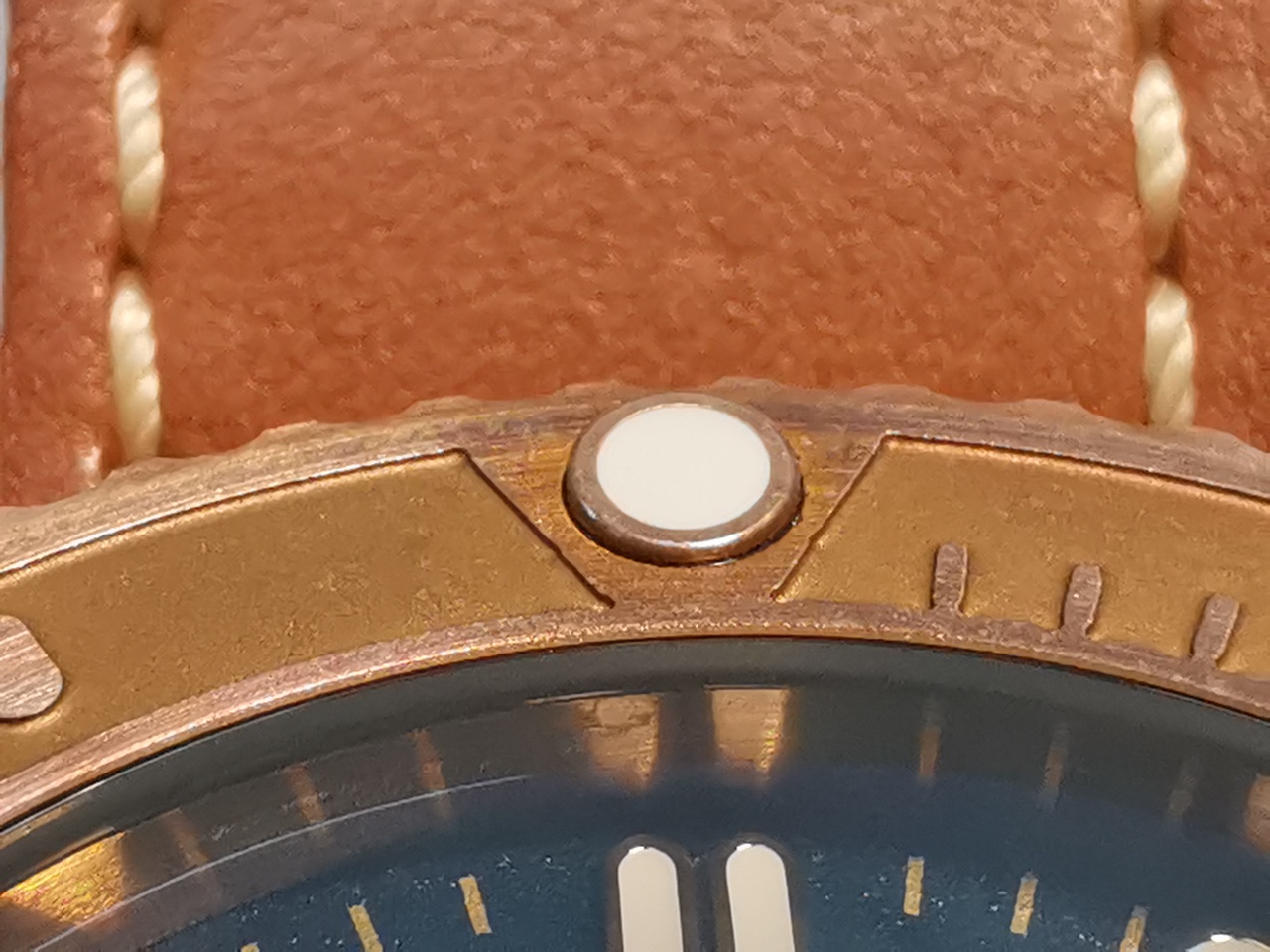 Теперь о характеристиках часов: Материал корпуса – бронза CuSn8. Диаметр корпуса 44мм, с заводной головкой 49мм, от ушка до ушка 53мм, между ушками 24мм, толщина 15мм. Корпус сатинирован со всех сторон, острых кромок не имеет. Безель на 120 щелчков, вероятно штампованный, бронзовый, без вставки, высотой 3,5мм. Верхняя сторона безеля имеет заметный рельеф, где фон тонко обработан пескоструем, а выступающие части имеют окончательную механическую обработку. На безеле отмечены основные минутные обозначения, и на 12 часах установлена метка, заполненная люминофором. Край безеля имеет фаску, как с верху, так и снизу. Гурт выполнен в виде редких зубцов, разделенных полусферическими канавками, диаметром 1,5мм. Фаски и зубцы, также имеют окончательную механическую обработку.