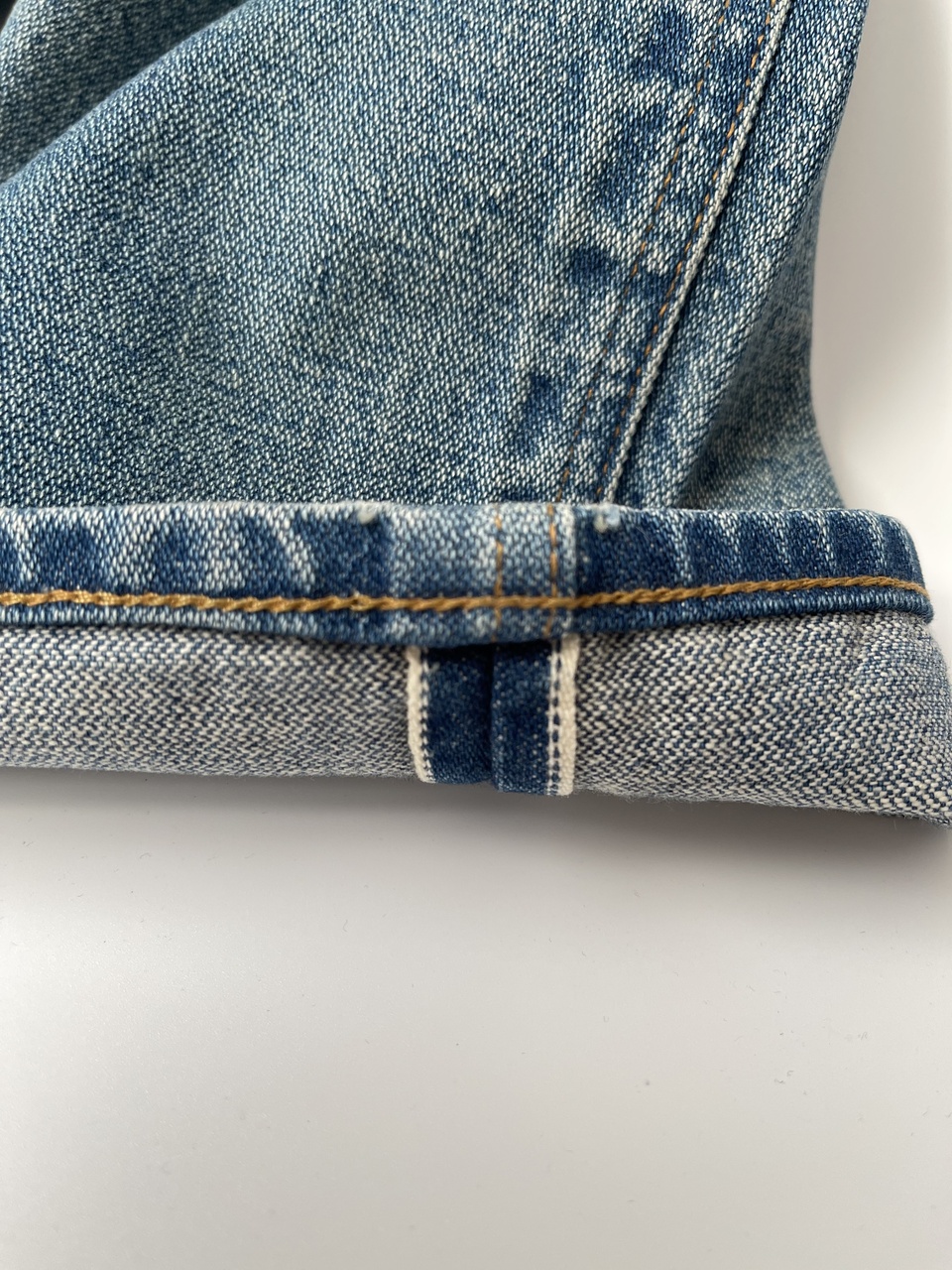 Модель изготовлена из высококачественного японского денима с искусственно созданными заломами и потёртостями.Джинсы светло-синего цвета свободного,комфортного кроя в области бёдер и слегка зауженными книзу брючинами.Пятикарманная модель имеет застёжку на фирменные металлические пуговицы серебристого цвета.Традиционный ярлык сзади с логотипом бренда выполнен из замши ярко-жёлтого оттенка.