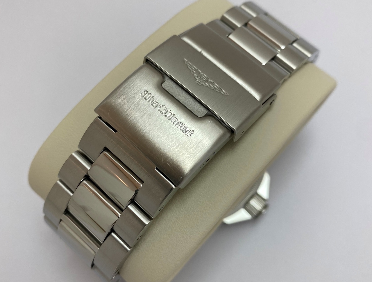 -Корпус: 44мм, сталь, сапфир. Завинчивающаяся заводная головка, водонепроницаемость 300м.