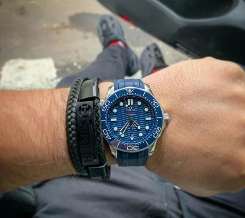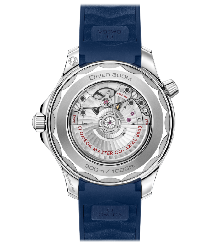 Водонепроницаемость модели позволяет погружаться на глубину до 300 метров. Не даст повода для дополнительных подзаводок хороший запас хода в 55 часов непрерывной работы механизма. Циферблат также отполирован синей керамикой и оснащен волнами с лазерной гравировкой и окном даты, расположенной на отметке «6 часов». Скелетные стрелки и рельефные указатели покрыты родием и заполнены белым люменисцентным содержимым, а гелиевый выпускной клапан имеет коническую форму. Ярко выделена красным цветом знаменитое слово Seamaster. При повороте часов на задней крышке корпуса появляется волнообразный край, а также сапфировое стекло, через которое вы можете увидеть одобренное METAS движение. Модель представлена в синем каучуковом ремешке, что плотно прилегает к корпусу.