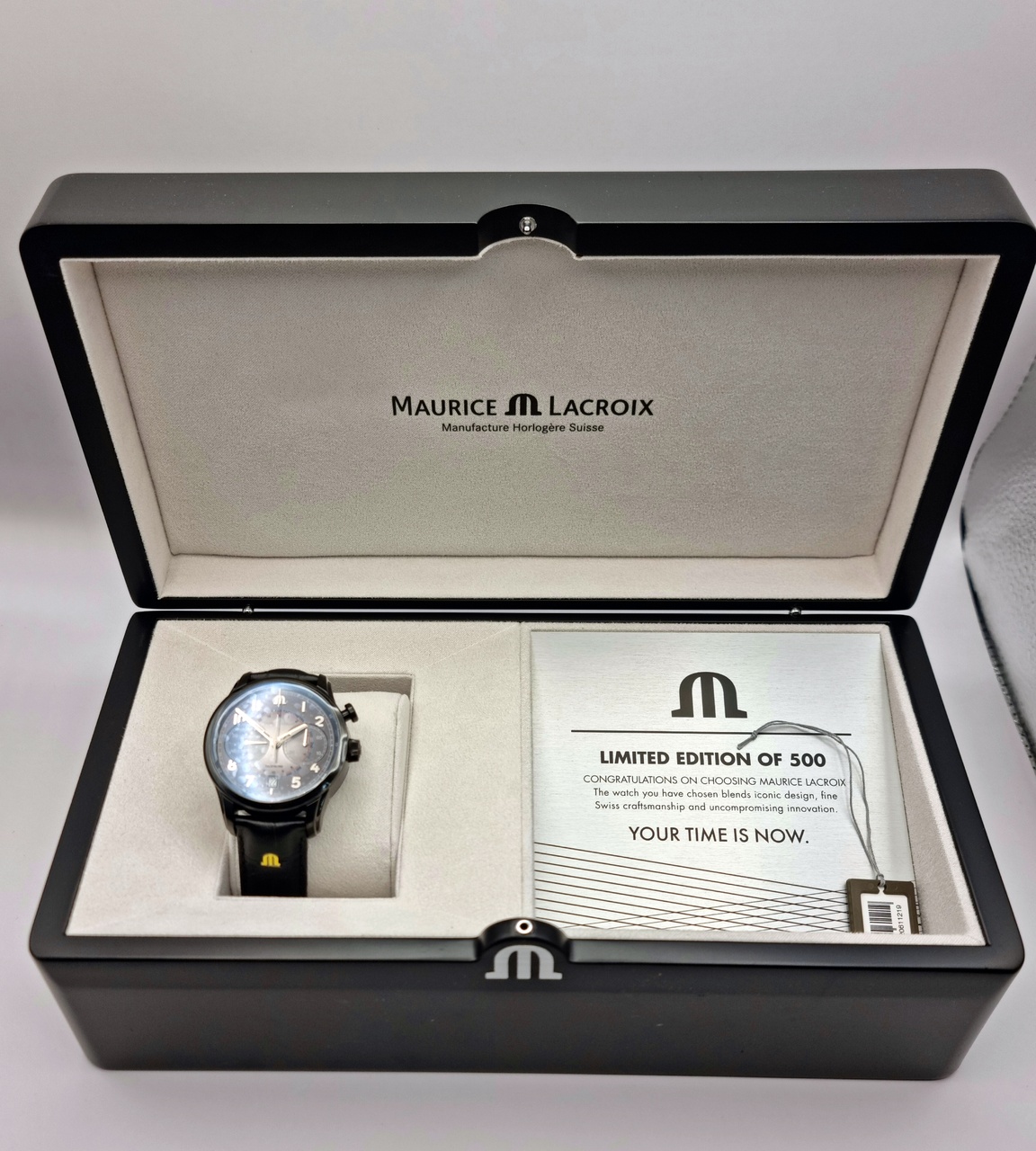 Строгость, лаконичность и изысканность форм в сочетании с непревзойденным качеством являются основными характеристиками хронографа компании Maurice Lacroix. Его функциональность является неотъемлемым элементом для тех, кто не мыслит своей жизни без скорости. Часы модели Pontos Chronograph Monopusher выпущены ограниченным количеством экземпляров в 500 штук на весь мир. Часы выполнены в корпусе из нержавеющей стали с чёрным PVD покрытием размером 41 мм. Механизм с автоматическим подзаводом работает от амплитуды движения руки. Часы имеют водонепроницаемость 100 м. Циферблат закрыт прозрачным антибликовым стеклом из сапфира высокой прочности, благодаря чему обеспечивается максимальная защита от сколов и механических повреждений. Из сапфира сделана и задняя крышка, которая дает возможность воочию увидеть детали механизма и вносит нотку неординарности. Ремешок из натуральной кожи с раскладывающейся стальной застежкой превосходно дополняет изысканный образ модели. Ограниченная серия (Limited Edition) 500 шт.