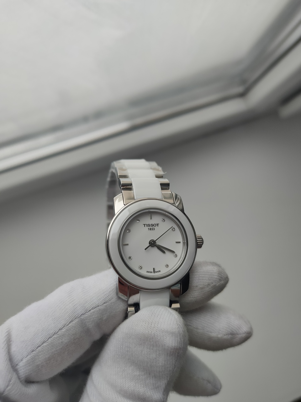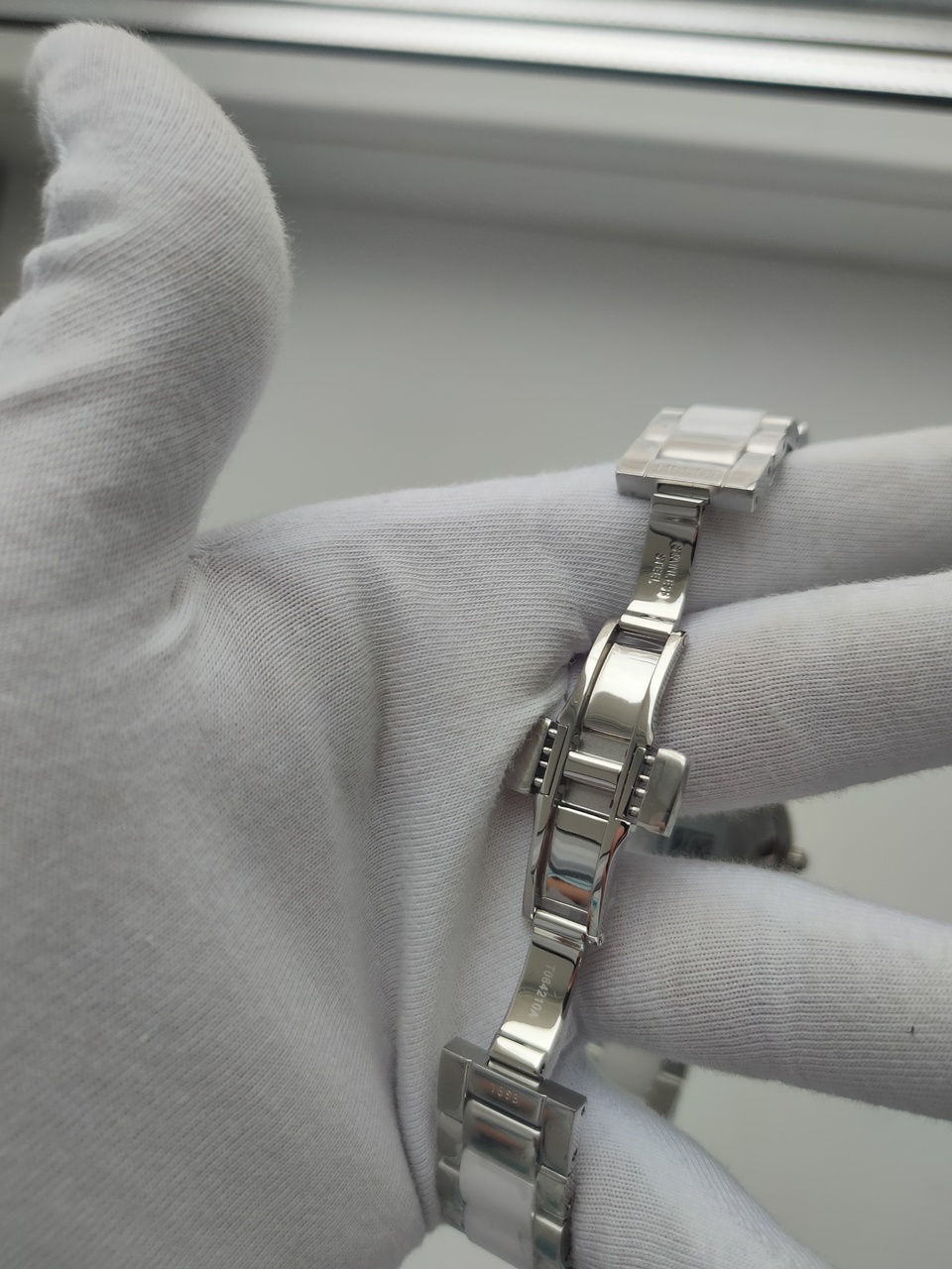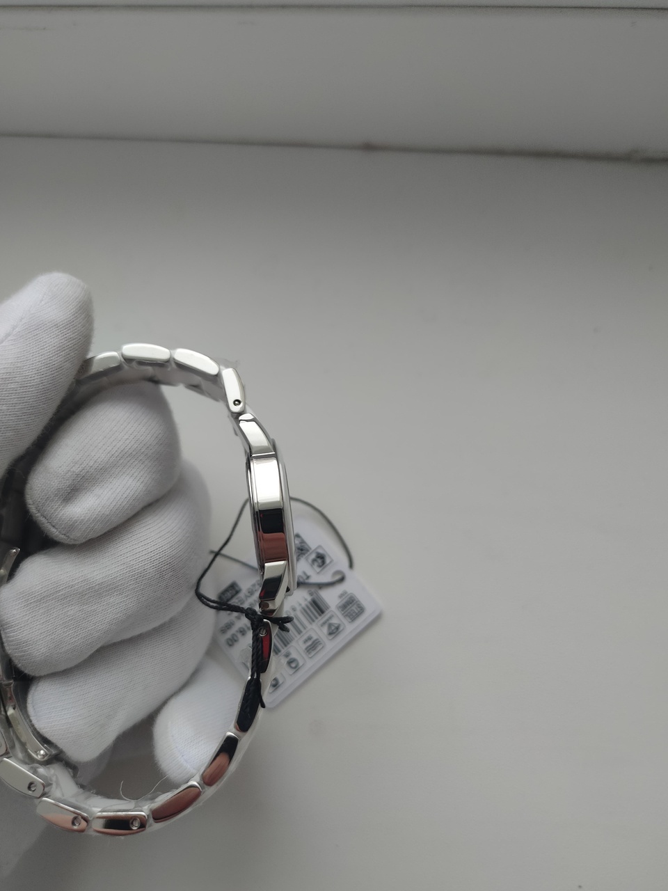 В продаже интересная кварцевая модель от именитого производителя с очень добротной отделкой. Бриллианты на метках (8 штук), белый керамический безель, отличный литой браслет с застежкой-бабочкой и белыми керамическими вставками, кабошон в заводной головке. В живую часы выглядят гораздо богаче и интереснее чем на фото.