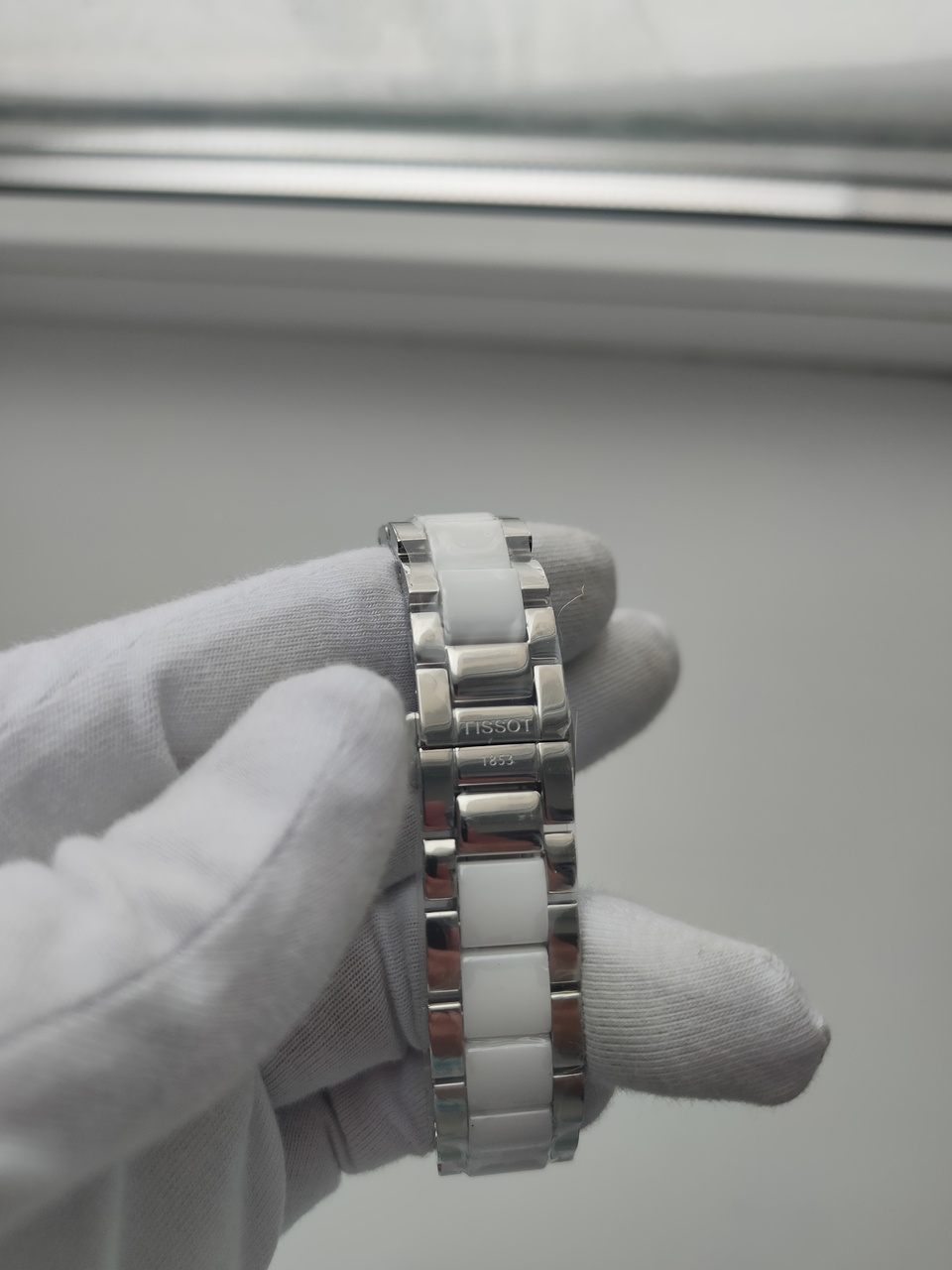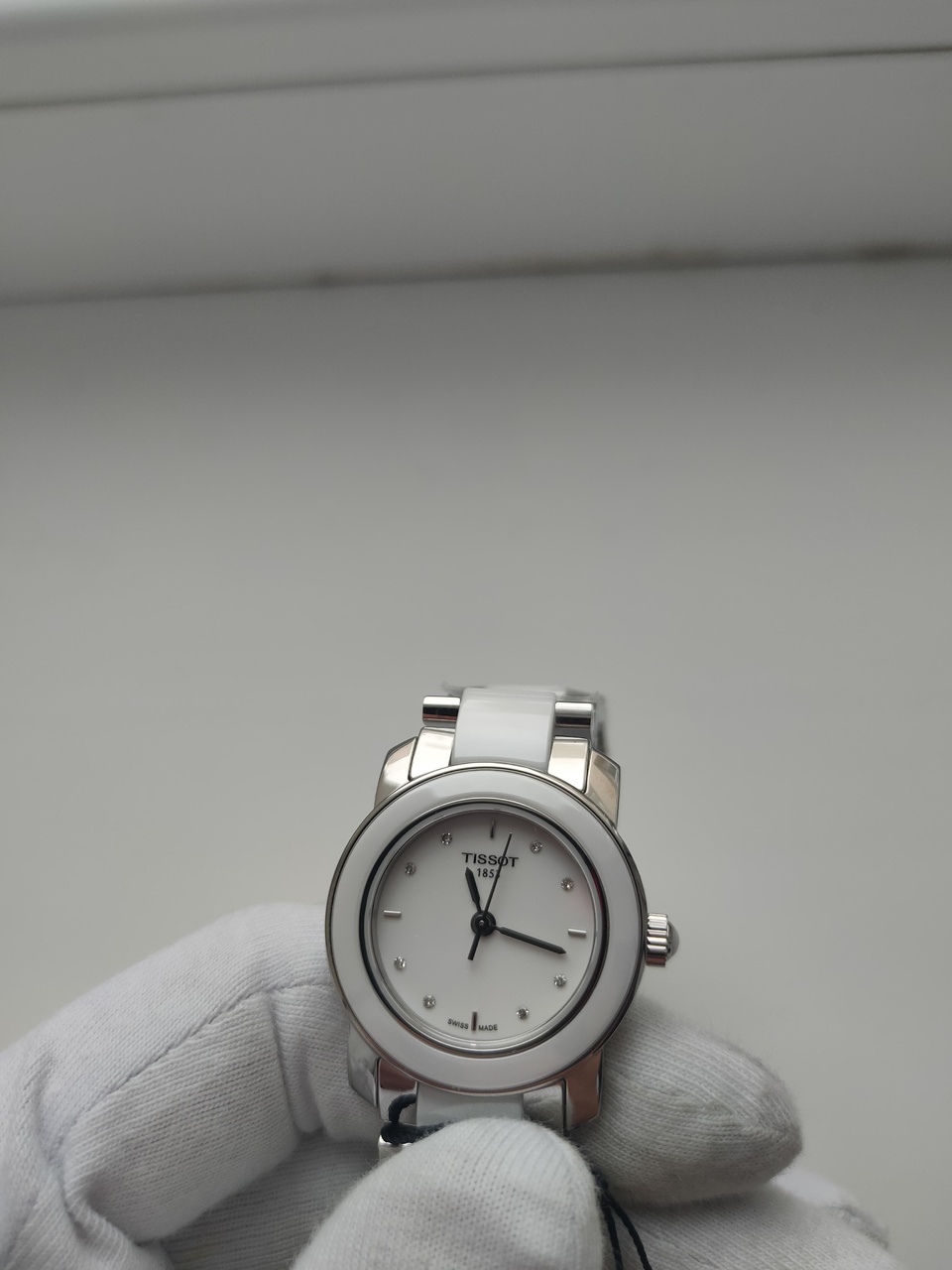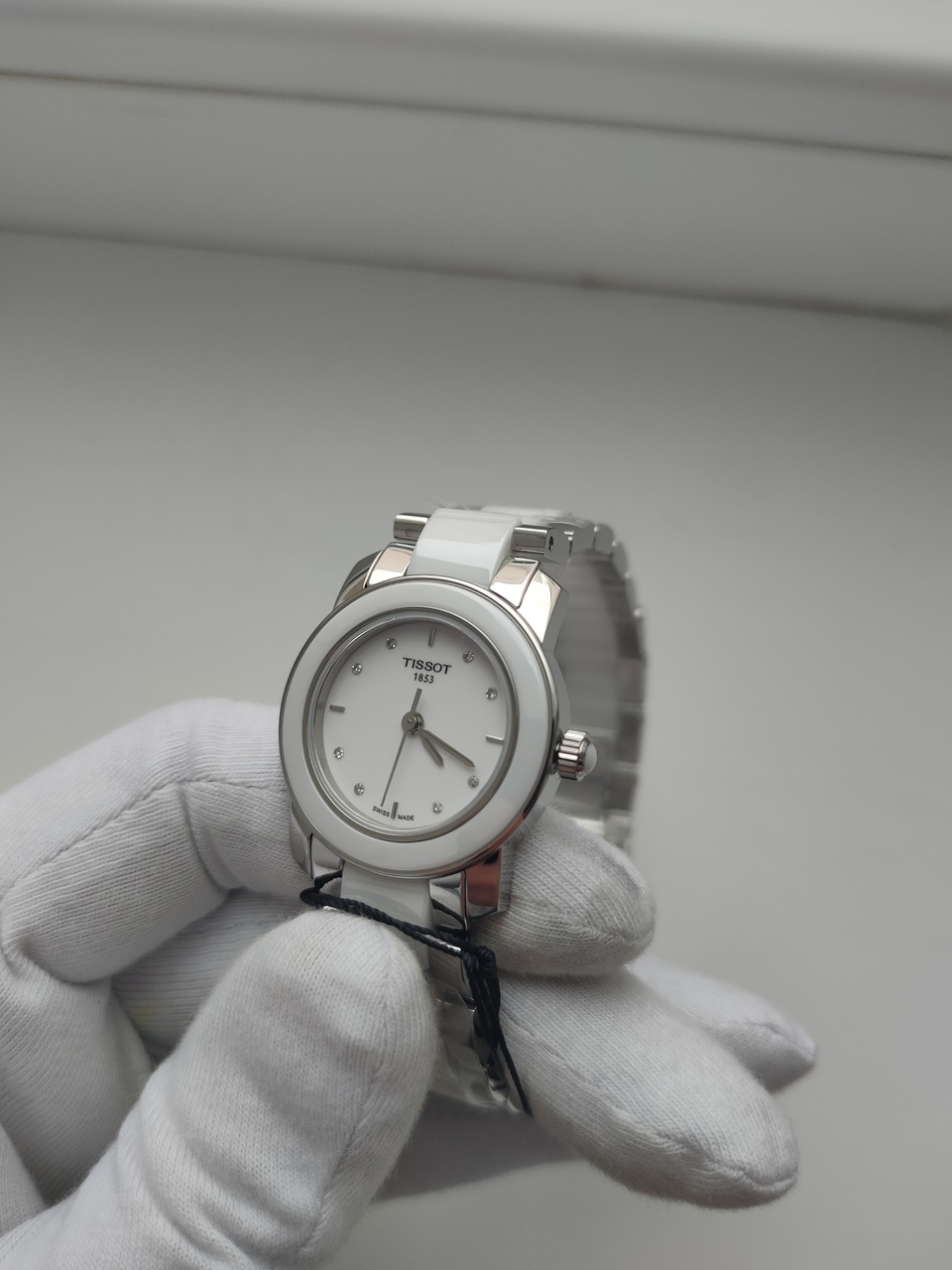 В продаже интересная кварцевая модель от именитого производителя с очень добротной отделкой. Бриллианты на метках (8 штук), белый керамический безель, отличный литой браслет с застежкой-бабочкой и белыми керамическими вставками, кабошон в заводной головке. В живую часы выглядят гораздо богаче и интереснее чем на фото.
