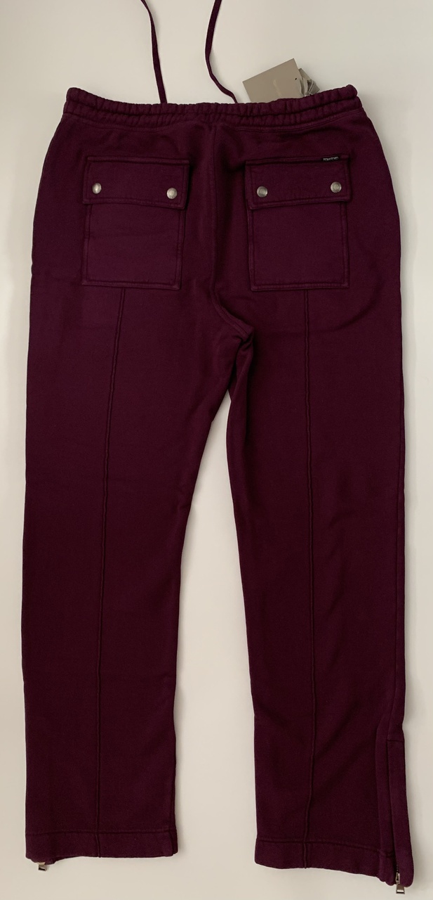 Брюки прямого кроя с фактурными,имитирующими стрелки швами,выполнены в спортивном стиле.Модель винно-пурпурного цвета изготовили из мягкого хлопкового трикотажа,что придаёт комфорт владельцу.Широкий пояс с кулиской,с помощью которого удобно регулируется посадка,крупные накладные карманы сзади,потайные молнии на низе брючин характеризуют данное изделие,идеально подходящее для путешествий и повседневной носки.