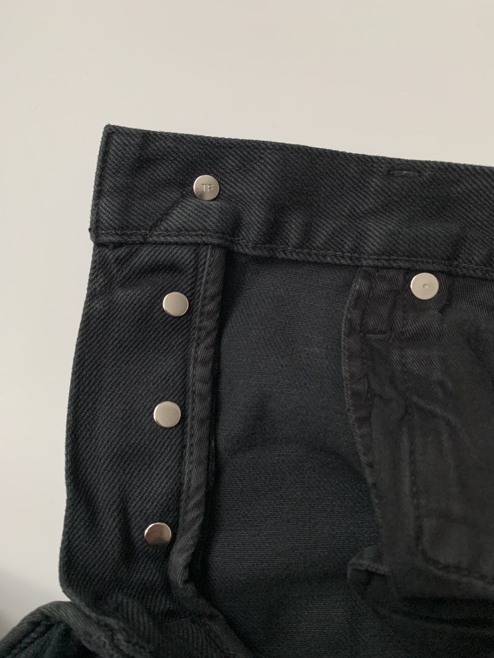 Классическая пятикарманная модель имеет застёжку спереди на металлические брендированные пуговицы серебристого цвета,традиционный ярлык с логотипом бренда выполнен из замши в тон изделию.Для пошива модели дизайнер выбрал мягкий прочный деним.Чёрный цвет,отсутствие декора и потёртостей делают прямые джинсы с комфортной посадкой на талии универсальным решением в гардеробе.