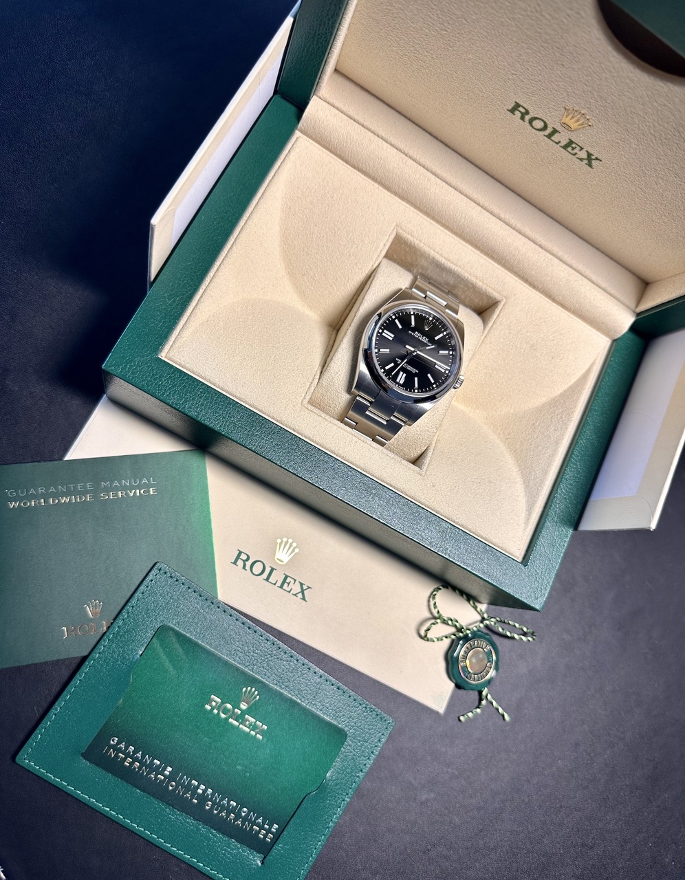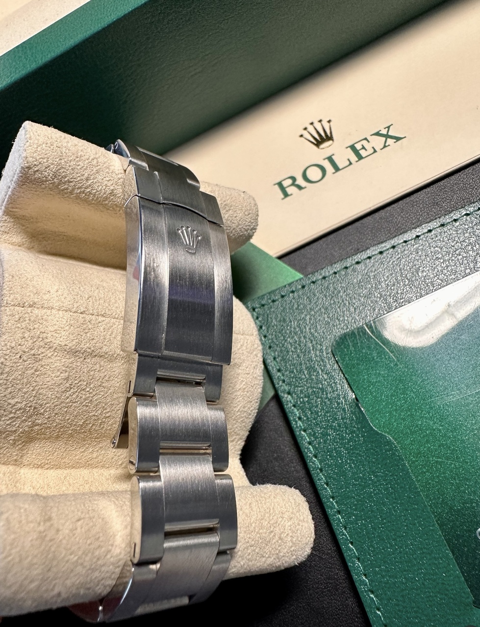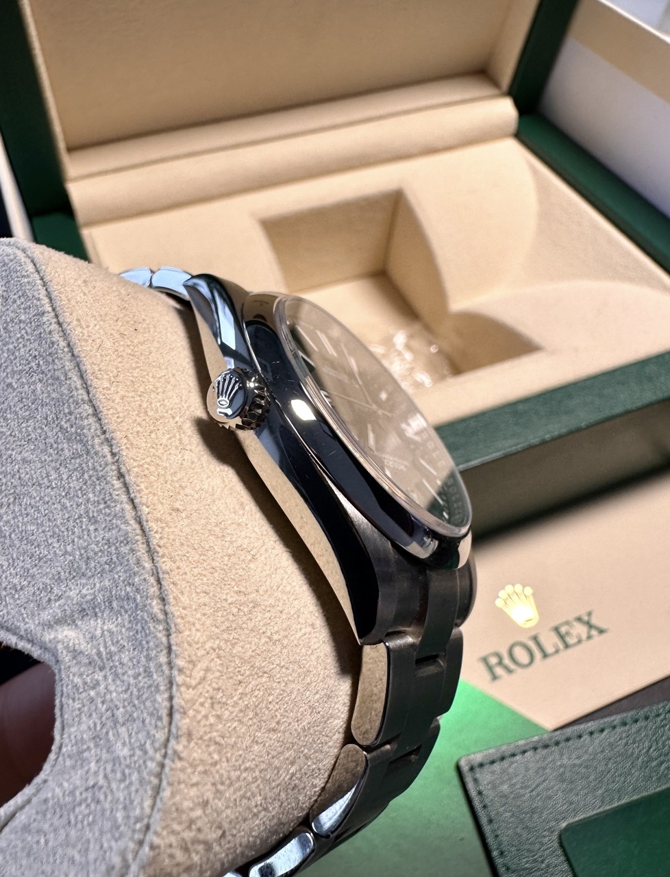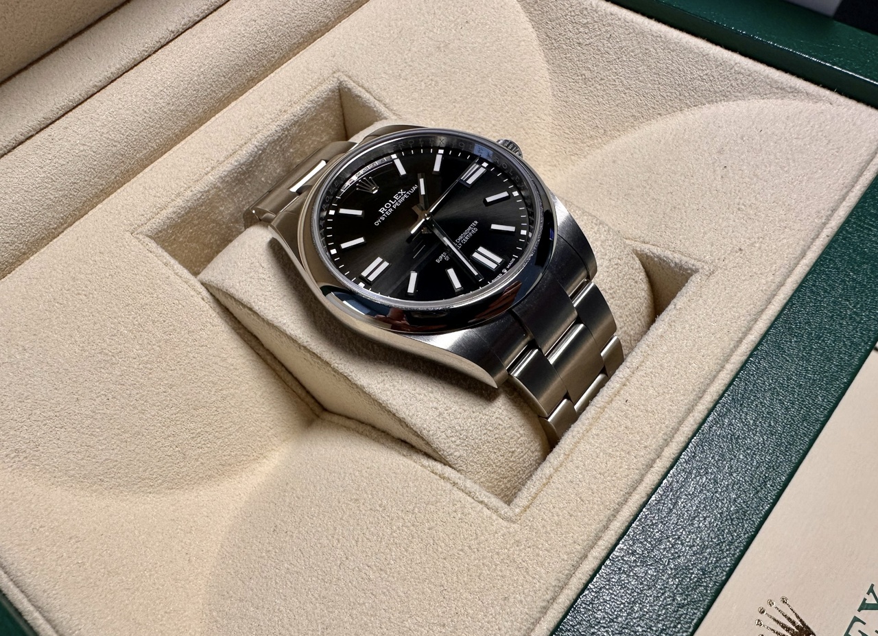 Продам часы ROLEX OYSTER PERPETUAL 41MM 124300-0002, были куплены 6 марта 2023 новыми у господина Pachan (дата продажи на карте от 25/11/2022). Послего этого аккуратно носились в офис и домой (около 20 выходов из коробки), следы носки отсутствуют. В комплекте часы/коробка/гарантия/холдер (всё как было).