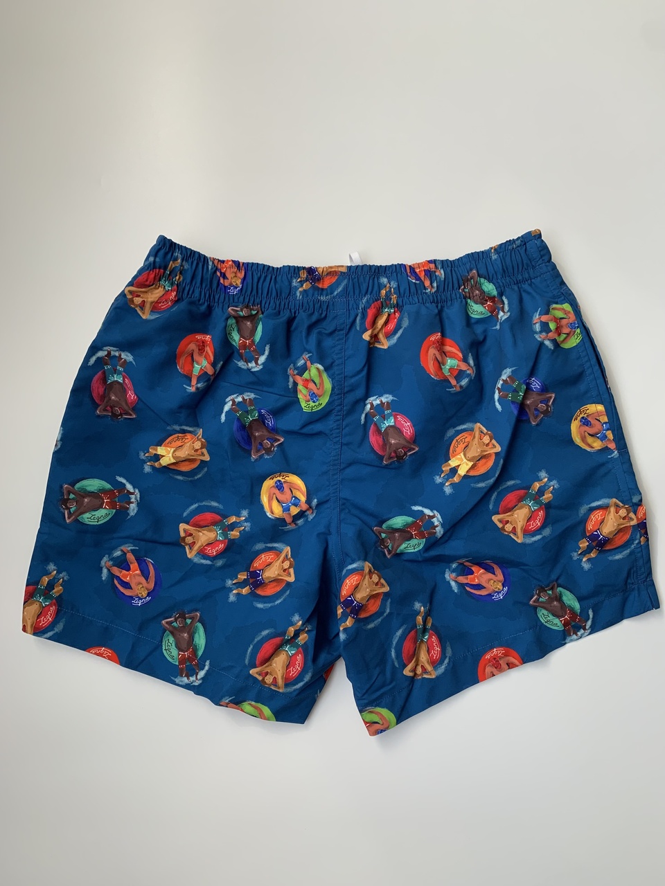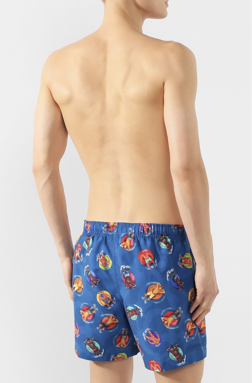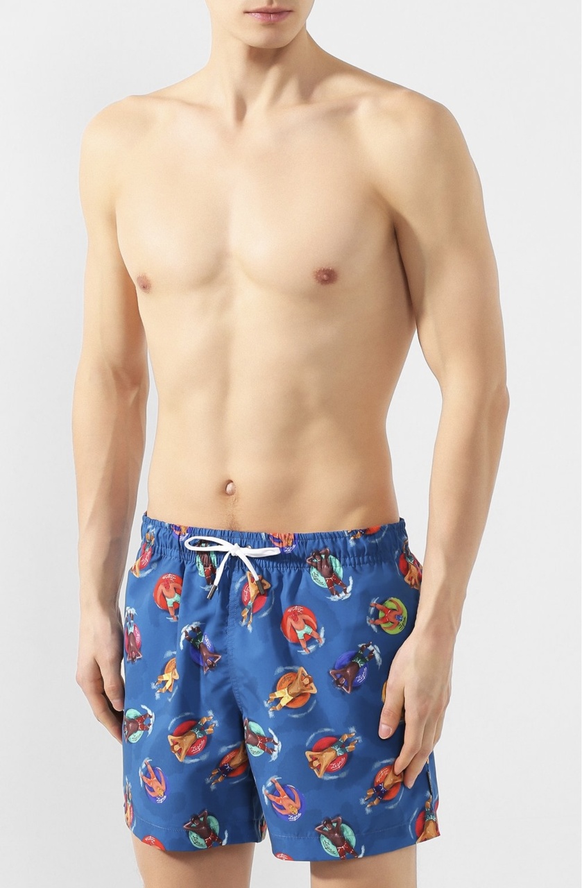Синие плавки-шорты с ярким разноцветным принтом - гарант беззаботного отпуска. За комфорт отвечают свободный крой, тонкая прочная быстросохнущая ткань с мягким матовым блеском и пояс-кулиска со шнуром, который удерживает изделие на теле при сильной волне.