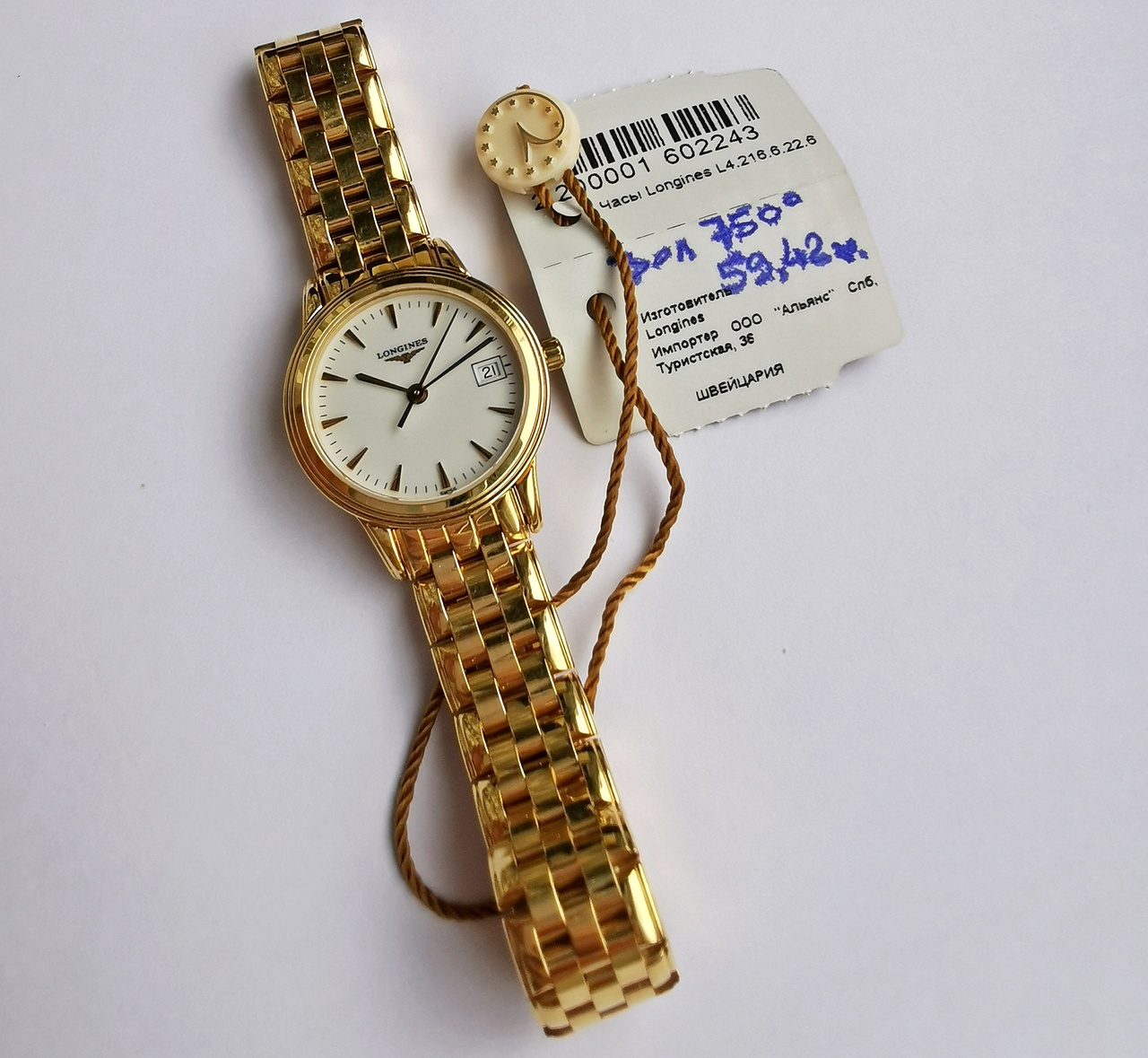 В продаже изящные аккуратные женские часы от старейшей швейцарской фирмы LONGINES в золотом исполнении, диаметр корпуса 25мм, сапфировое стекло, надёжный швейцарский кварцевый механизм, часы витринный образец, практически без следов примерок. В комплекте часы, бирка Консул (не снятая, на часах так и висит), коробка, инструкция. Часы и браслет изготовлены из золота 750ой пробы и имеют вес чистого золота 59,42гр.