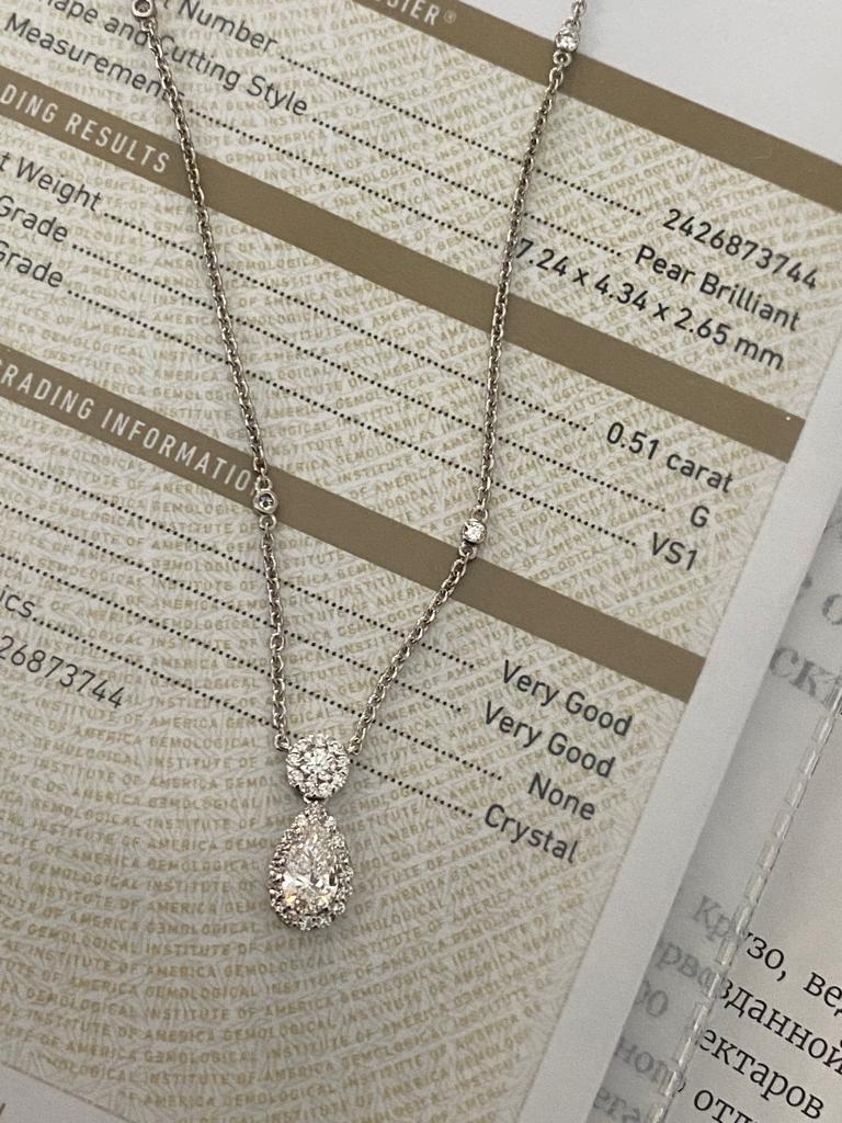 В продаже кулон-колье с бриллиантом огранки "Груша" 0,51 карат (сертификат GIA) и круглыми бесцветными бриллиантом.